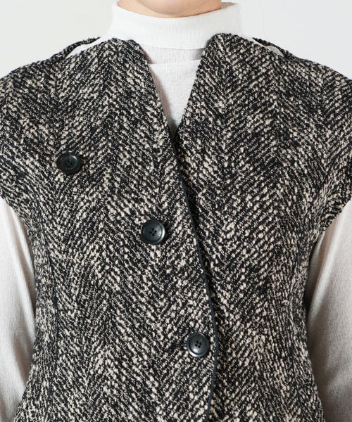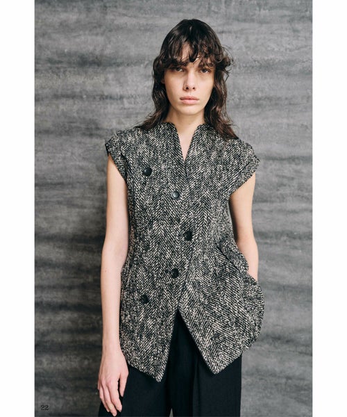 【デザイン】AKIRANAKA(アキラナカ)のベスト。クラシックな素材を使用しながらも、前衛的なディテールで魅せる一着。ノーカラー仕様でミニマルな印象を保ちつつ、ネックラインは横に広がったボートネック風のカッティングが顔まわりをすっきりと見せ、女性らしさを際立たせます。最大の特徴は、ユニークな配置であしらわれたフロントボタン。スタイリングにモードなアクセントを加えます。