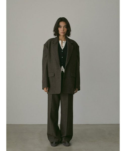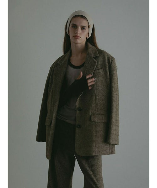 【デザイン】クラシカルなチェック柄で仕上げたテーラージャケット。 暖かみのあるツイード素材で季節感漂う1枚。 直角肩のシルエットを採用、角度を調整し着やすさを意識しデザインしています。 素材感や低めに設定したボタン位置はヴィンテージライクな印象を演出。 同素材のチェックツィードセンタークリースパンツとセットアップでの着用はもちろん、デニムなどとラフに合わせるのもおすすめです。