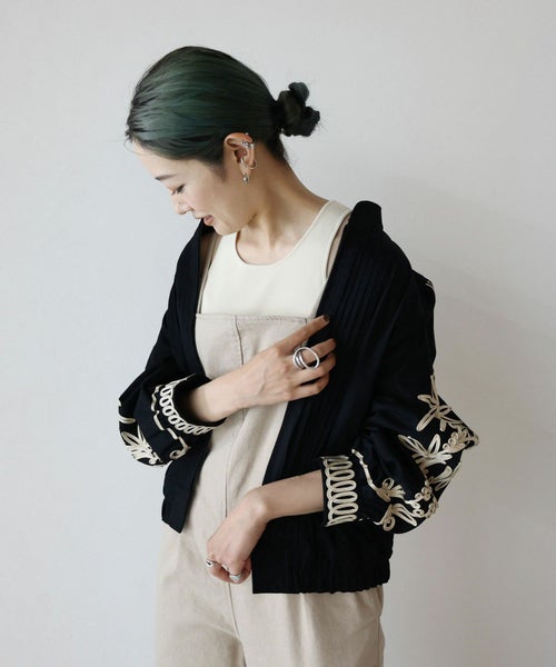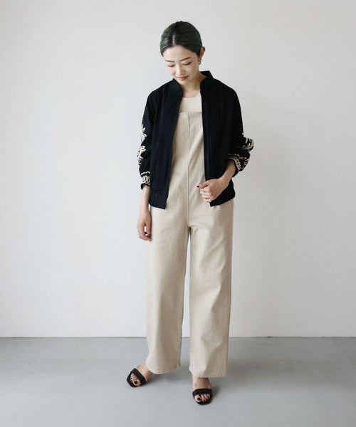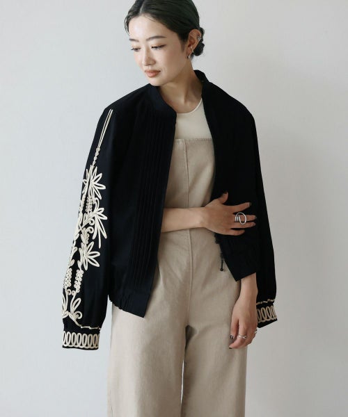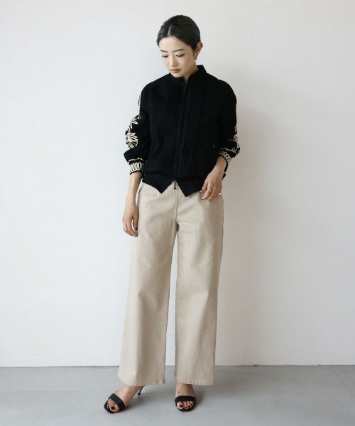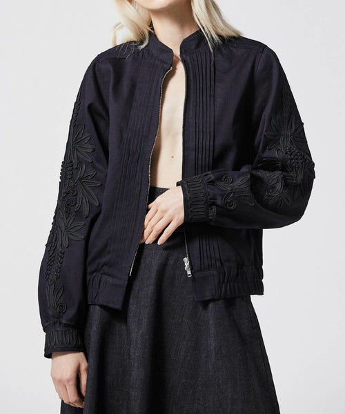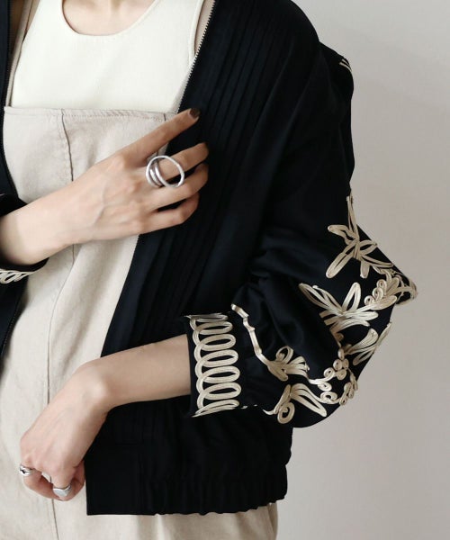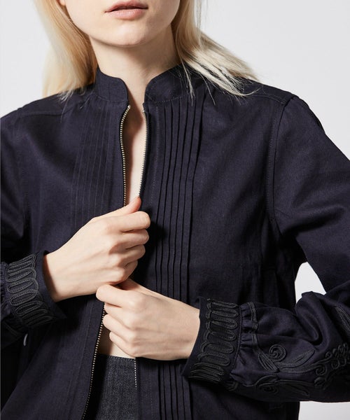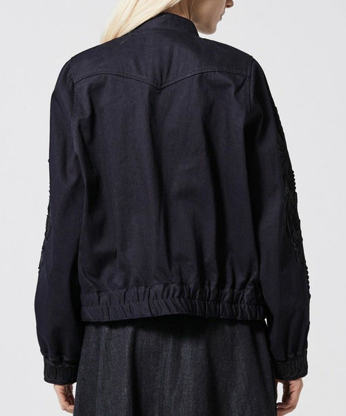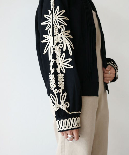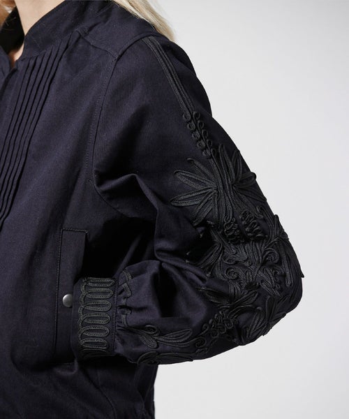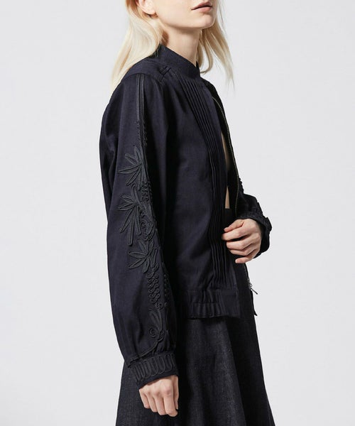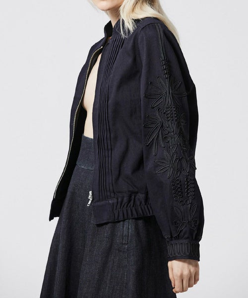 ステッチワークのスタンドカラーや、フロントのピンタックなどメンズライクなディテールが特徴的な デニムブルゾン。袖とカフスには大胆なコード刺繍が施されおり、上品でモード感のある仕上がりに。8.2ozの程よい艶感のあるデニム生地を採用し、今までにないデニムブルゾンが完成しました。