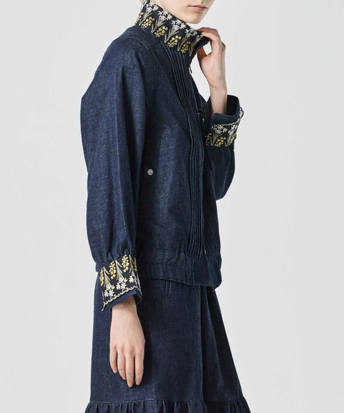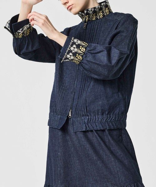 【デザイン】 ロキト定番のチュール刺繍を袖と襟元にあしらったブルゾン。胸元のピンタックがクラシカルで、デニム素材ながらも上品な印象を与えます。お袖はふんわりとさりげなくボリュームを出していて、女性らしい印象に。軽くて羽織りやすく、ほどよく保温性もあるので、季節の変わり目のアウターとして大活躍してくれます。