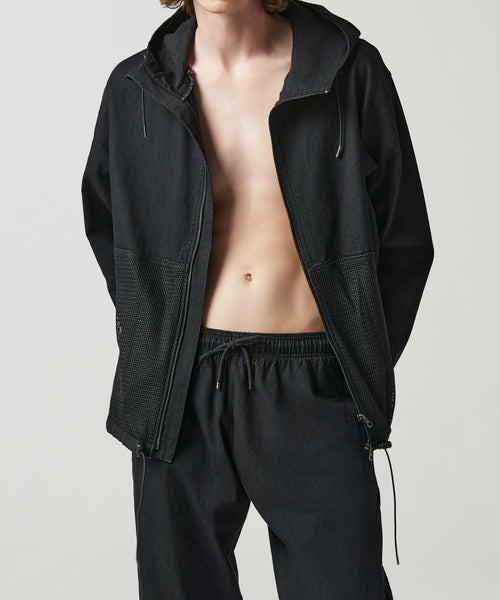 【デザイン】 マーカのアノラックジャケットをフルジップ仕様に変更したデニムジェケット。サイズ感もコンパクトに修正されています。前身頃にマットなメッシュ生地をハイブリッドすることで、モダンな印象に仕上げています。生地とウォッシュはマーカウェアのトラックパンツ(JD-PT51-23MKW))に合わせており、セットアップで着用することも可能。