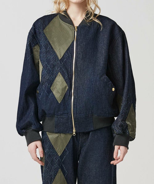 デニムとナイロンを組み合わせたMA-1ブルゾン。レーザーによるパンチング加工でアーガイル柄を表現。洗い加工により、パンチング部分に花が咲いたような立体的な表情が生まれ、華やかな光沢感を演出します。ユニセックスでお楽しみいただけます。