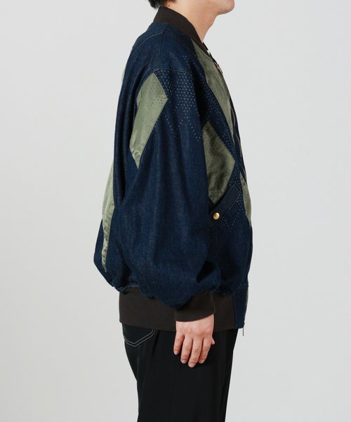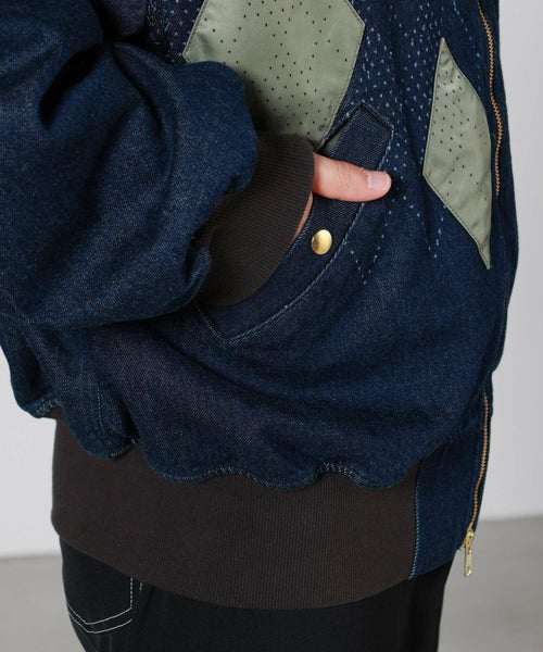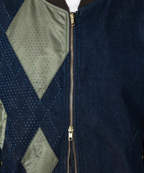 【デザイン】デニムとナイロンをコンビネーションで合わせたMA-1ジャケット。 レーザーによるパンチング加工でアーガイル柄を表現しており、縫製後に洗いをかけることによって、パンチング部分に花が咲き、より立体的な表情が生まれています。 ナイロンをドッキングすることで、華やかな光沢感があるジャケットです。