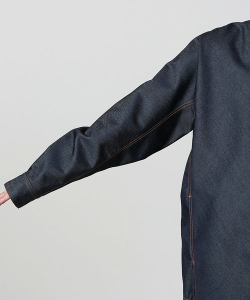 【デザイン】 OVERCOAT(オーバーコート)のデニムジャケット。丁寧に打ち込まれたオレンジステッチが印象的な、上品さのあるデニムシャツジャケットです。ブランドが定番で展開しているシャツジャケットの形を新素材で作成しております。サイドの生地の作りや、絶妙な裾のラウンドカット、肩のアクションプリーツなど、ブランドらしいパターンメイキングが光るアイテムです。デニム素材でありながらウールで仕上げることで、経年劣化なく長く愛用して頂ける新たな魅力のあるアイテムです。