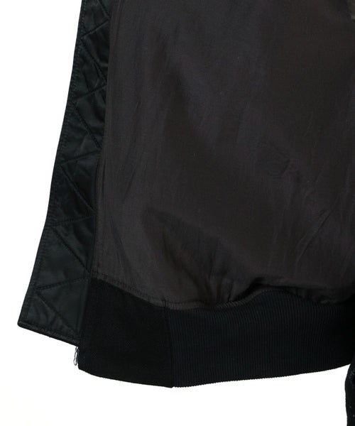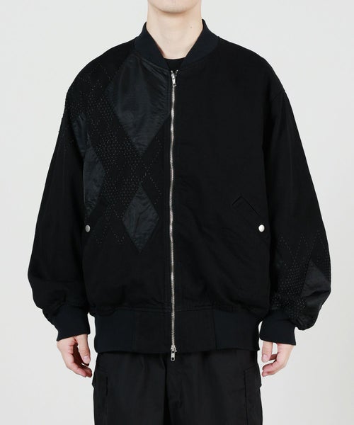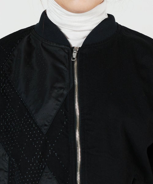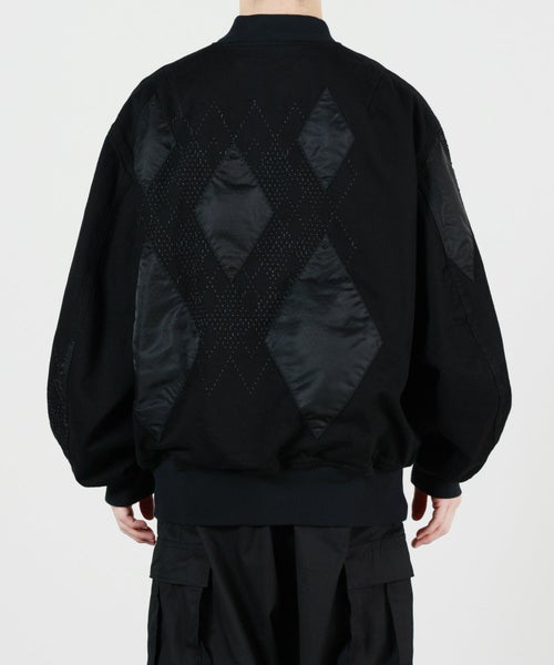 【デザイン】デニムとナイロンをコンビネーションで合わせたMA-1ジャケット。 レーザーによるパンチング加工でアーガイル柄を表現しており、縫製後に洗いをかけることによって、パンチング部分に花が咲き、より立体的な表情が生まれています。 ナイロンをドッキングすることで、華やかな光沢感があるジャケットです。