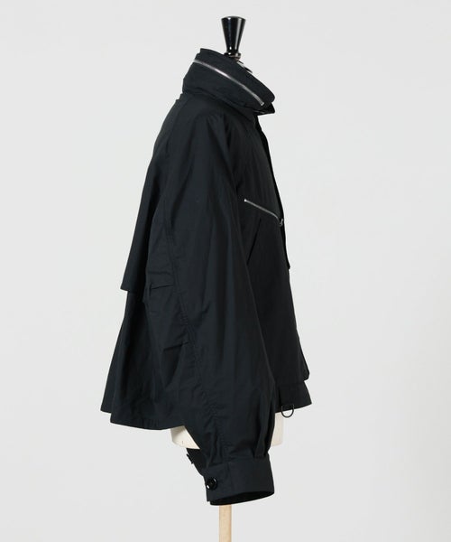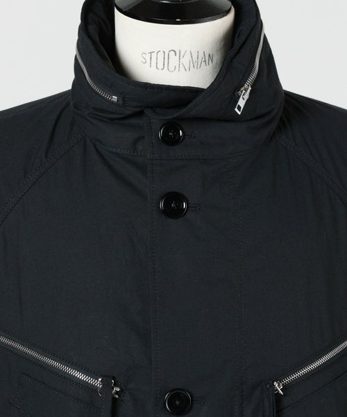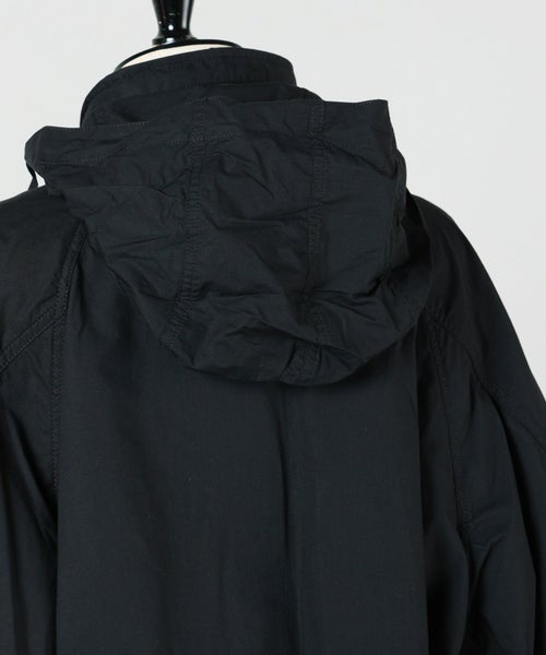 【デザイン】LEMAIRE(ルメール)のパラシュートブルゾン。オーバーサイズのボックスシルエットで、ダーツ入りのラグランスリーブと、ボタンと隠しジッパーによる2wayフロントクロージャーが特徴です。ファネルネックには、調節可能なコードが付いたパッカブルフードが内蔵され、裾にもコードアジャスターが付いているので、フィット感を自由に調整可能。袖口には通気性を高めるアイレット、背面には雨風を防ぐストームフラップなど、実用的なディテールも備えています。フロントには、サイドからアクセスできるベンチレーション付きパッチポケット、ジッパー付きチェストポケット2つ、鍵を取り付けられるDリング付き。半裏地仕様で、快適な着心地を実現しています。
