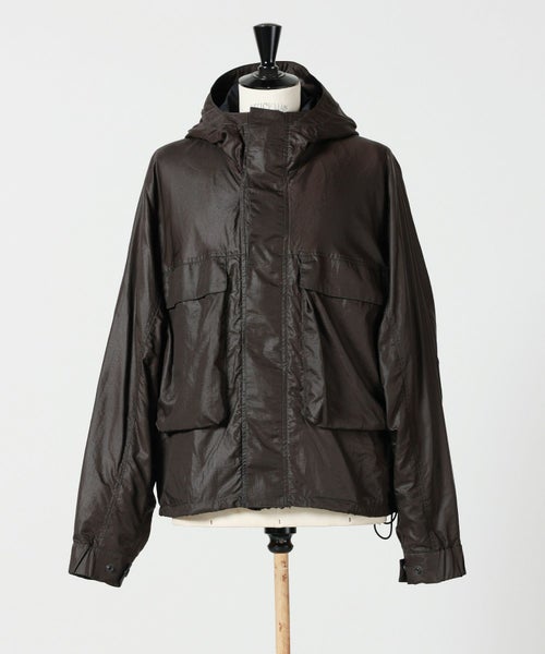 【デザイン】LEMAIRE(ルメール)のジャケット。撥水加工を施した機能素材を用いた、フード付きのショート丈デザインが特徴です。全体を包み込むようなミニマルなフォルムながらも、深みのあるエスプレッソカラーが都会的な印象を与えます。フロントには隠しジップとスナップボタンの二重構造を採用し、すっきりとした見た目と防風性を両立。左右には大容量のフロントポケットを配し、デザイン性と実用性を兼ね備えています。さらに、ウエスト部分にはドローストリングを内蔵しており、シルエットを自分好みに調整可能。軽やかさの中に洗練された存在感を放つ一着で、カジュアルにもモードにもマッチします。