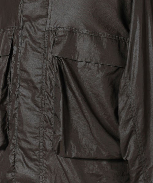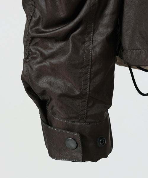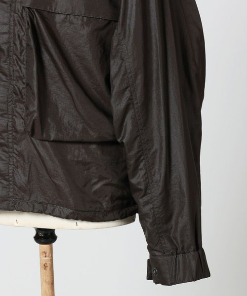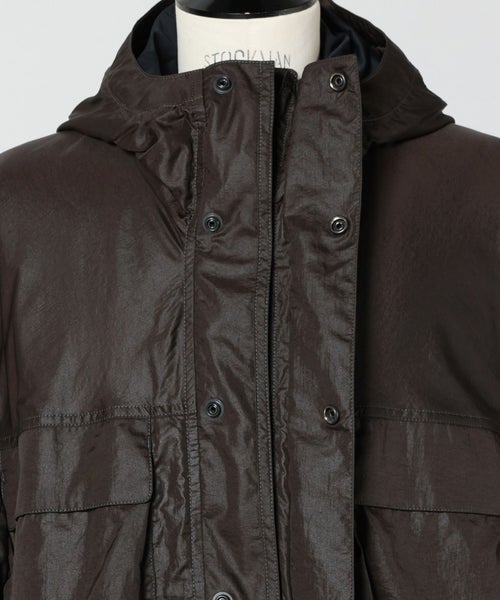 【素材】ポリアミドとナイロンを混紡した軽量ファブリックを採用。柔らかくしなやかな質感で、動きに合わせて自然に馴染みます。表面には上品な微光沢があり、光の角度によってさりげない陰影を生むため、シンプルなデザインに奥行きをプラス。撥水加工により、軽い雨や汚れを弾くため、デイリーからトラベルシーンまで快適に着用できます。実際に手に取るとハリ感がありながらも柔らかく、着用時には軽さと保温性のバランスが絶妙。季節の変わり目にも活躍する、機能と美しさを両立した素材です。