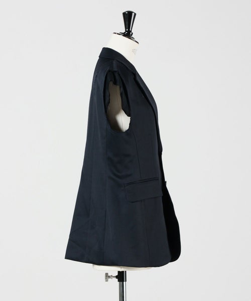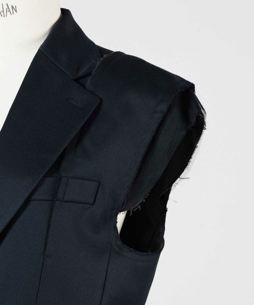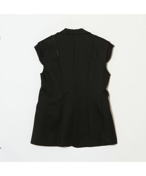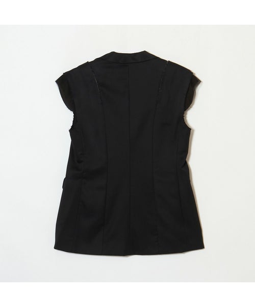 【デザイン】Chika Kisada(チカ キサダ)のベスト。テイラードのきちんと感と、チュールのモードなムードが溶け合う、独創的な一着です。袖部分にあしらわれたチュールが、まるでレイヤードしているような奥行きを演出。肩や袖には敢えて断ち切りのようなディテールを施し、繊細さの中にエッジィな表情を加えています。ボタンはシングル仕様、すっきりとした開き具合で洗練された印象に。身体のラインが美しく見えるよう計算されたカッティングにより、着た瞬間からシルエットの美しさを実感できます。インナーにシャツやカットソーを重ねることで、シーズンレスなレイヤードスタイルを楽しめるのも魅力です。