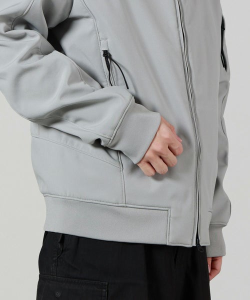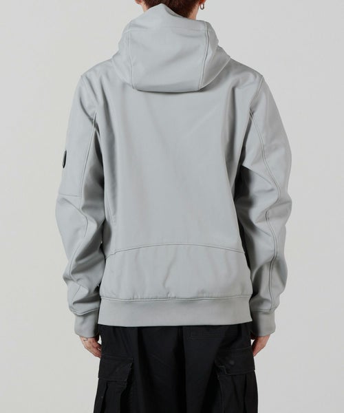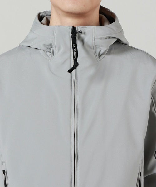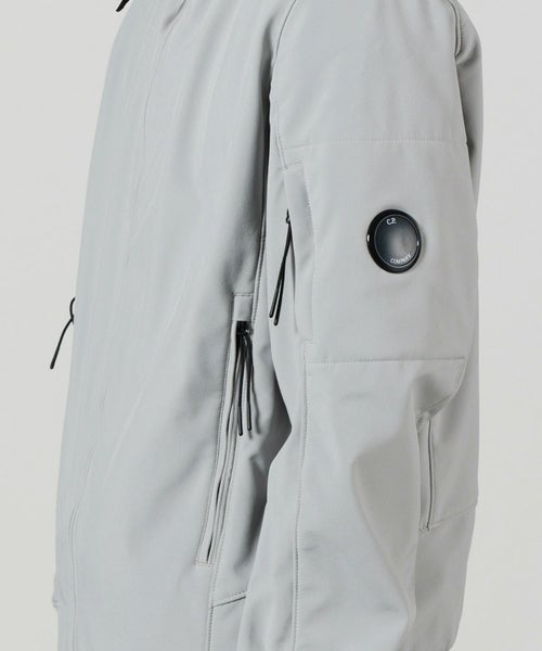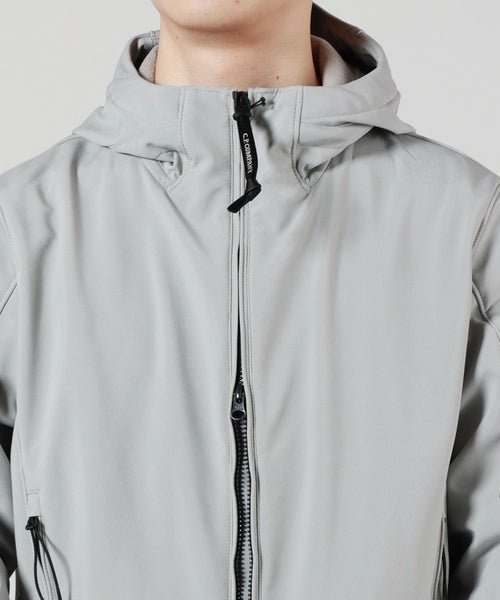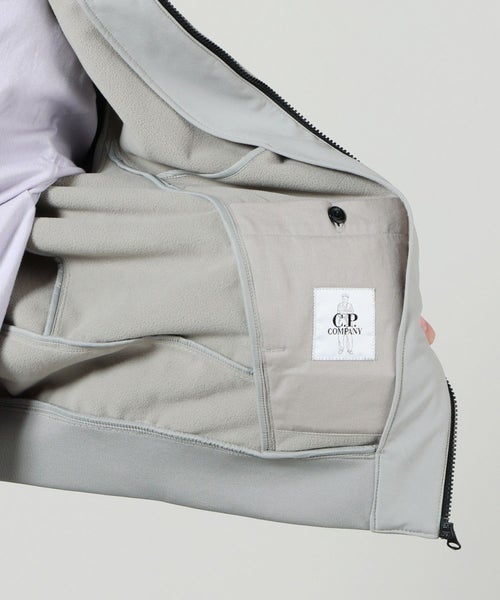 【デザイン】 C.P. Company(シーピーカンパニー)のソフトシェルフードブルゾン。ハイネック仕様のフーデットで、比翼ファスナーが全体的にミニマルな印象を強調。袖と裾のリブでスポーティなデザインに仕上がっています。左袖には C.P.カンパニーのアイコンであるレンズが配置されています。