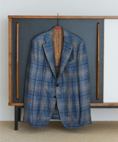 【デザイン】ISAIA(イザイア)のジャケット。「CAPRI(カプリ)」は、胸周りにはハンドメイドによる増芯を配し、立体的で自然なボリュームを生み出す仕立てが特徴です。二の腕にかけて丸みを帯びたシルエットは、身体を包み込みながらグラマラスな印象を演出。肩パッドを省いたマニカカミーチャ仕様のショルダーは、ナポリ仕立てらしい軽やかで柔らかなラインを描きます。格子柄のブルーが清涼感と知的な雰囲気を添え、クラシックなラペルデザインと相まって、シャツやタイを選ばず幅広いコーディネートに対応可能。ビジネスからドレスシーンまでスタイルを格上げする一着です。