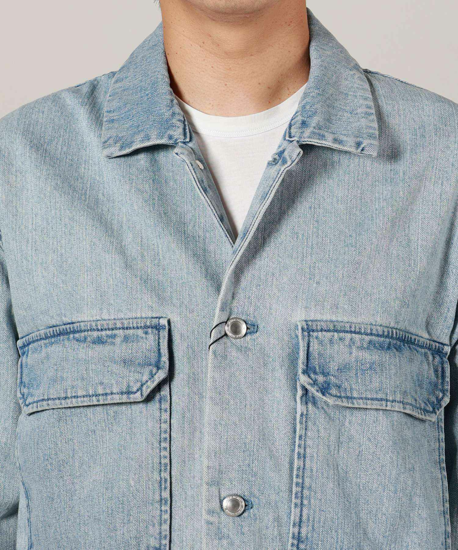 【デザイン】 マーカウェアのテーラードシャツジャケットをベースに作成。テーラードのような高い袖山により、着用時の美しいシルエットを追求しています。また、第1ボタンを開けた際のVゾーンはやや深めに設計しており、絶妙な抜け感を演出してくれます。ジャパンデニムオリジナル釦を使用しており、アクセントをプラス。