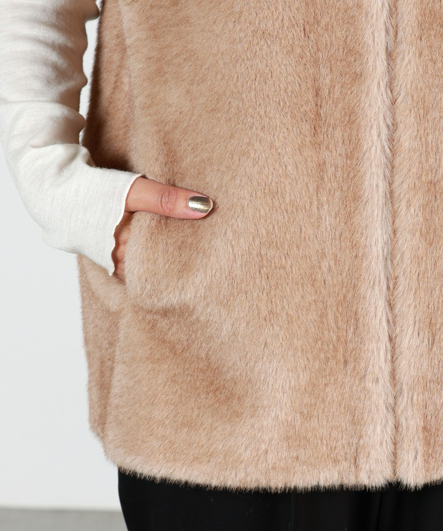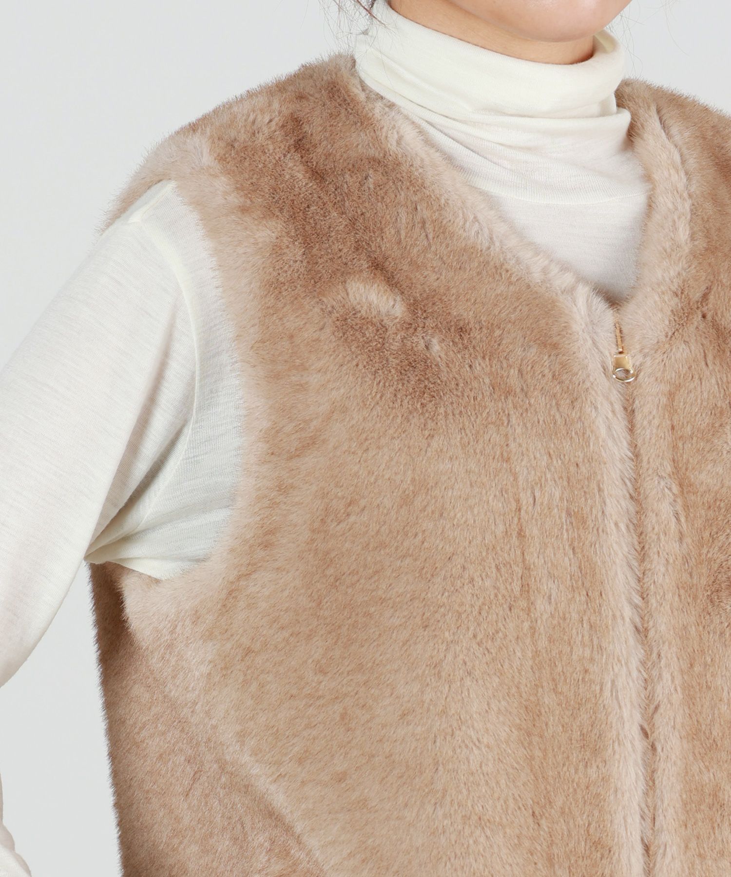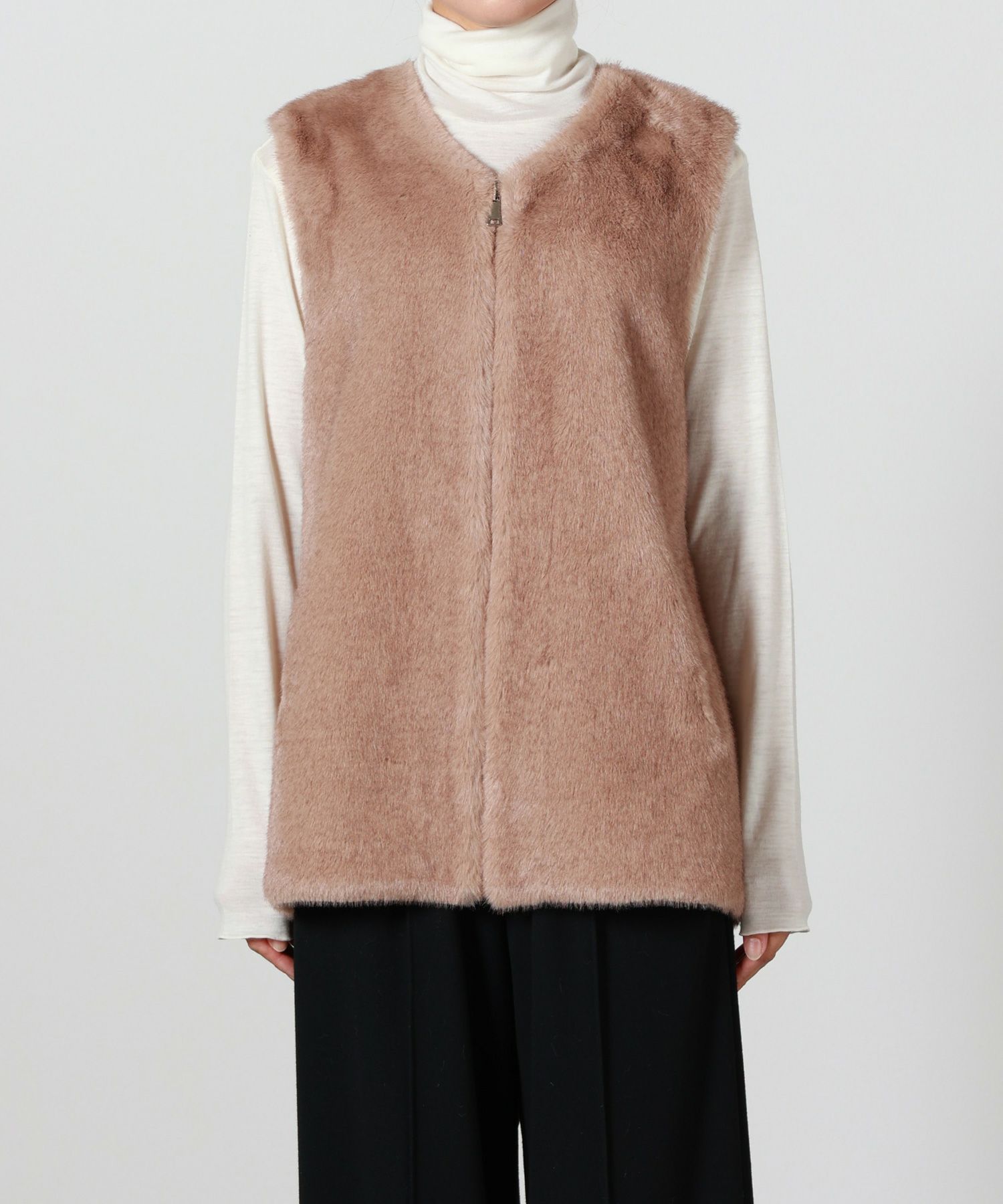 【デザイン】Lou Andrea(ルーアンドレア)のベスト。品格のあるファー素材。Vネック仕様なので、インナーを選ばず、Tシャツから厚手のニットまでレイヤードを楽しめ、スタイリングに華やかさを加えてくれるアイテム。また、ジップの開け閉めのアレンジで、同じベストでも印象を変えてご着用頂けます。コーデにプラスワンでこなれ感を演出してくれる、この秋冬に重宝するアイテムです。