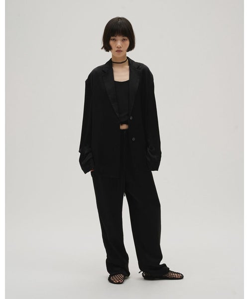 【素材】 表地にはアセテート100%のサテン生地を採用し、上品な光沢と滑らかな質感が特徴。軽やかで肌離れが良く、快適な着心地を実現します。裏地にはポリエステルを使用することで、着脱のしやすさと安定感をプラス。程よい落ち感と美しいドレープが、シルエットをより引き立てる仕上がりです。