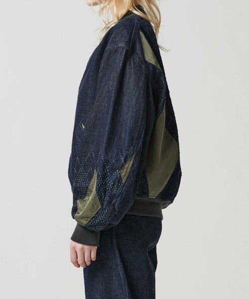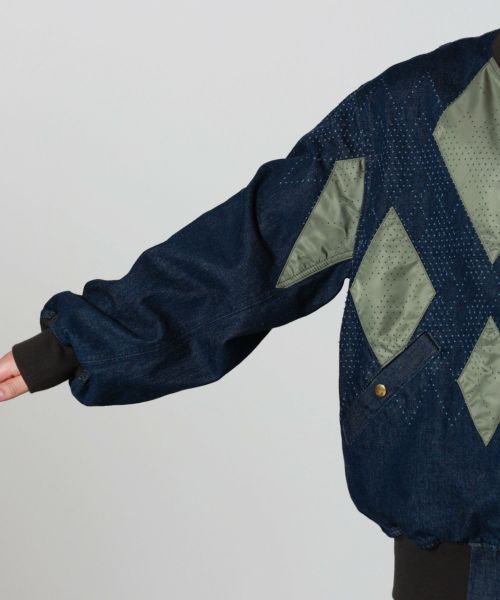 【デザイン】デニムとナイロンをコンビネーションで合わせたMA-1ジャケット。 レーザーによるパンチング加工でアーガイル柄を表現しており、縫製後に洗いをかけることによって、パンチング部分に花が咲き、より立体的な表情が生まれています。 ナイロンをドッキングすることで、華やかな光沢感があるジャケットです。