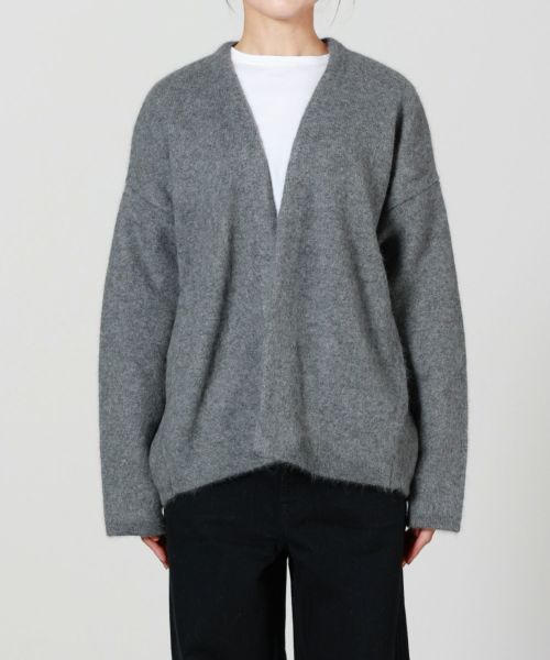 【デザイン】 MICA&DEAL(マイカ&ディール)のニットカーディガン。ボタンが無くサラッと羽織るカーディガンなので、リラックス感のある着こなしに。タイトスカートやワイドパンツなどボトムスを選ばずコーディネートしやすい一枚です。