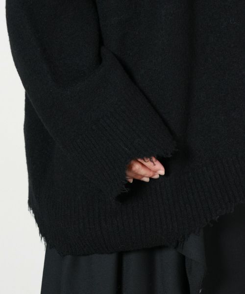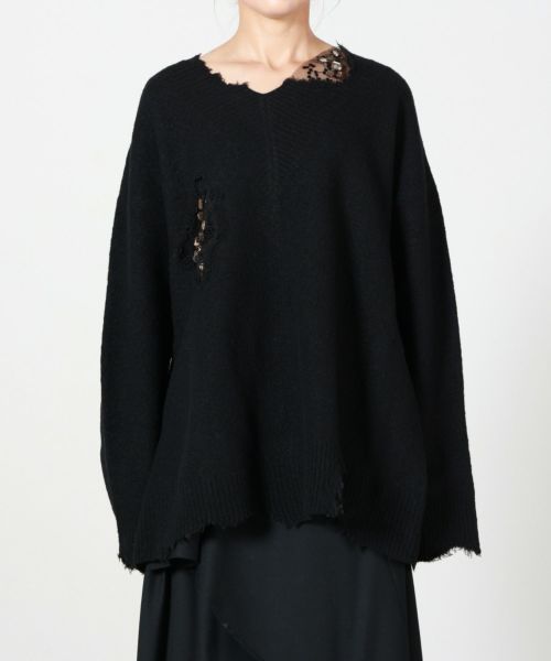 【デザイン】EZUMi(エズミ)のセーター。ビーズ刺繍を施した独特なデザインが目を引くデストロイセーターで、ダメージ加工と構築的なシルエットが融合した一枚です。深めのVネックとオーバーサイズのゆったりとしたシルエットにより、ラフな中にもモード感を演出。シンプルなボトムスと合わせるだけで、スタイルのアクセントになる存在感があります。