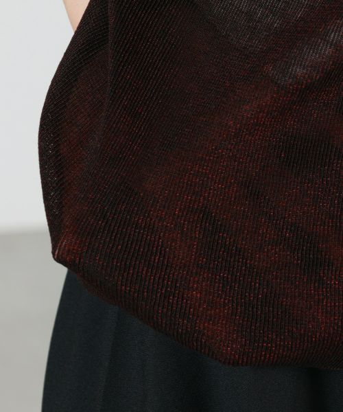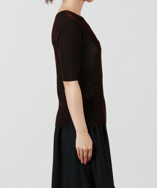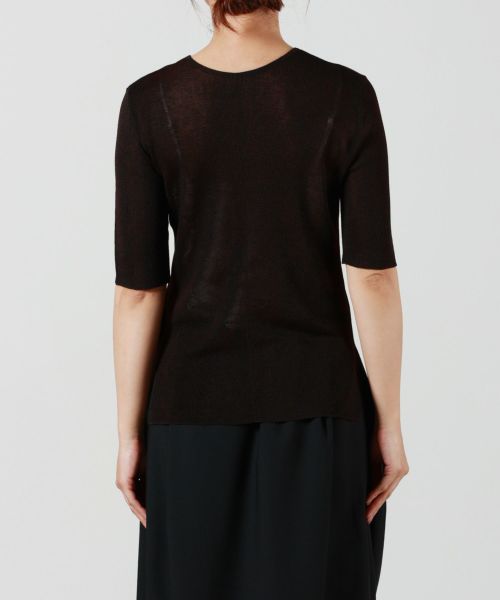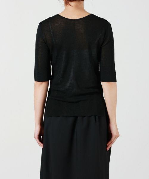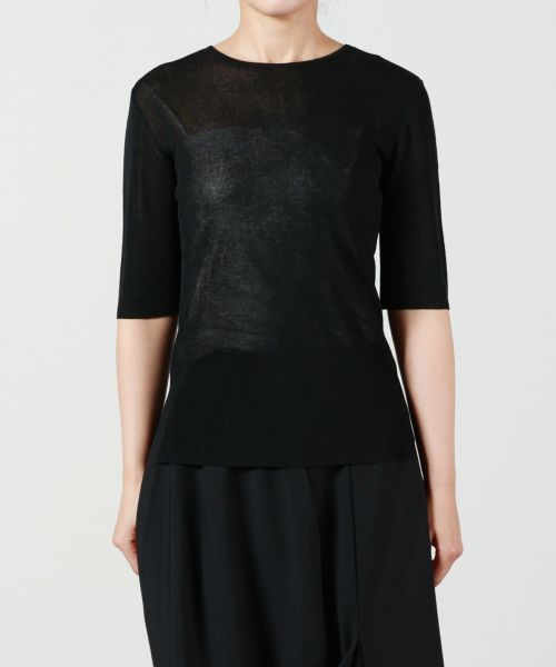 【デザイン】 ELENDEEK(エレンディーク)のTシャツ感覚で着られるモードな印象のシアーニットプルオーバー。程よくシャリ感のある編地は清涼感があり、さらりとした着心地に。二の腕をカバーする5分袖や細めのバックタック編みなど、さりげなくスタイルアップを叶えるディテールもポイント。前後2way仕様なのでタック面をフロントにすることも可能です。マシーンウォッシャブル対応でデイリーに取り入れやすく1枚着としてもインナー使いとしても活躍します。