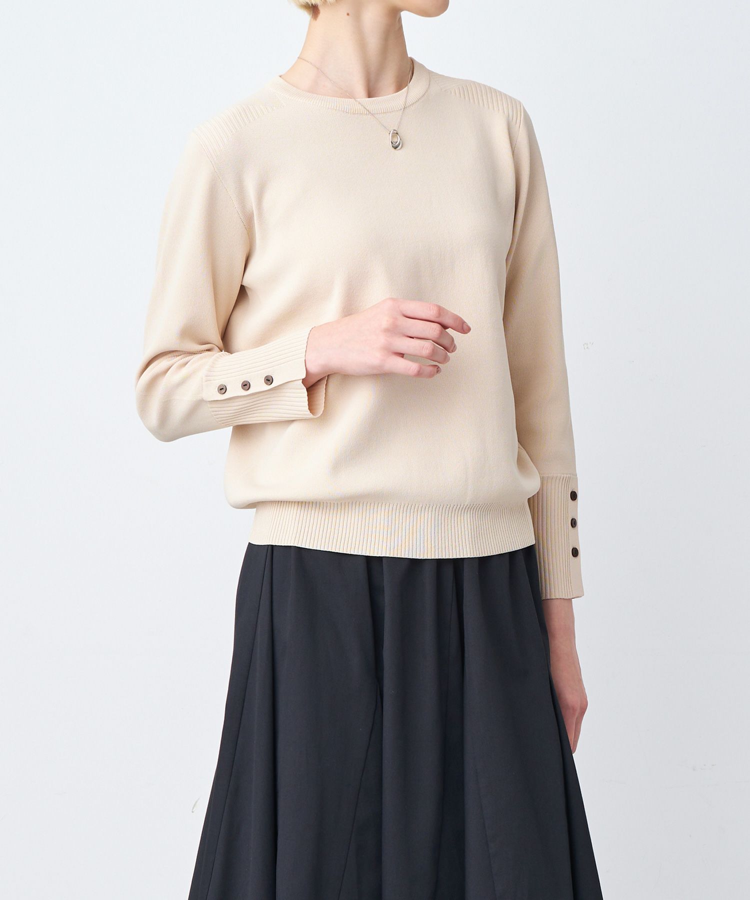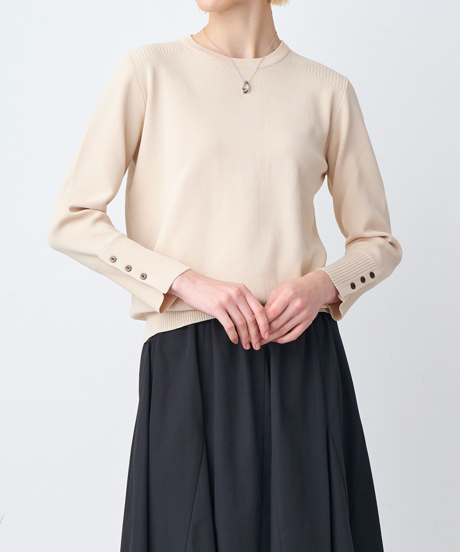 シンプルながら洗練されたデザインが魅力の「スリーブボタンクルーネックニット」。このアイテムは、毎シーズン多くのお客様からリピートされる名品で、色違いで揃える方も続出。何度も選ばれる理由は、その高い汎用性と快適な着心地にあります。特に肌に優しくフィットし、発色の良さと型崩れしにくい丈夫さがリピーターの心を掴んで離しません。春から秋までの3シーズンにわたり、長く着回せる優秀ニットです。
