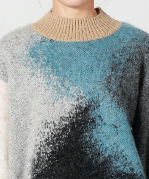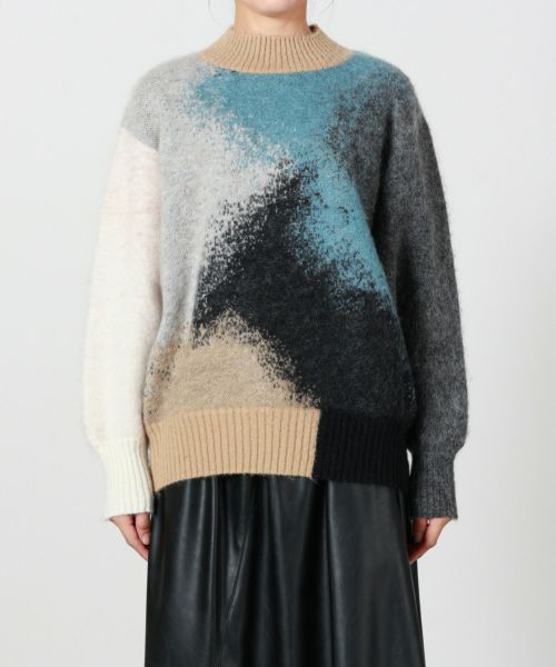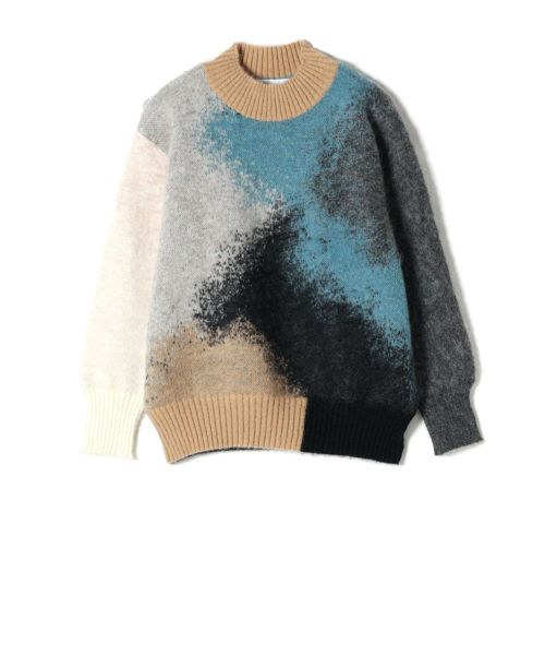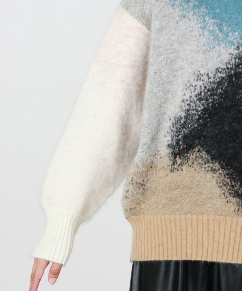 【素材】ウール素材を使用したダブルジャカード編みにより、色と色が繊細に混じり合った深みのある柄を表現。さらに編み上げ後に起毛加工を施すことで、色彩の境界を柔らかくぼかし、絵画的なニュアンスを加えています。肌触りも柔らかく、あたたかさと着心地を両立した上質な仕上がりに。アート性と実用性を兼ね備えた、今季を象徴するニットです。