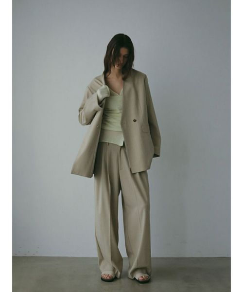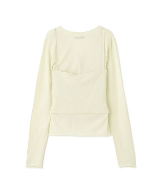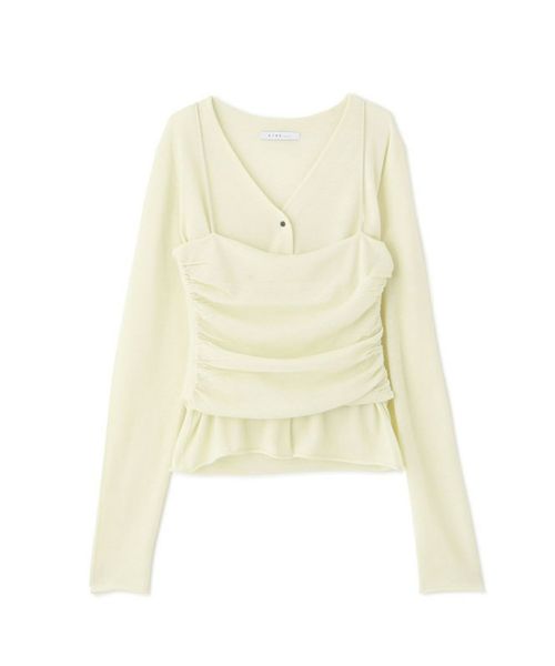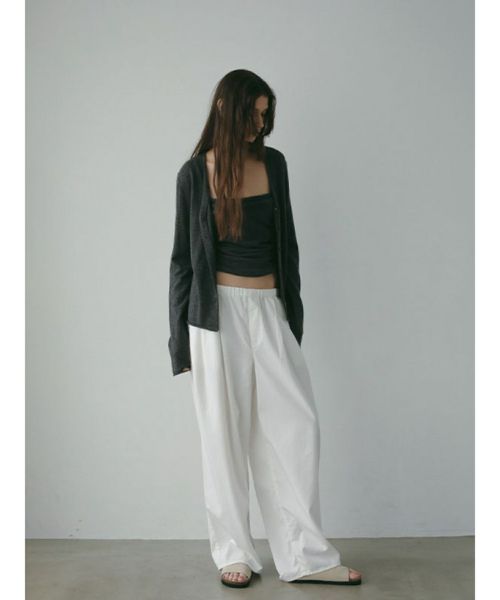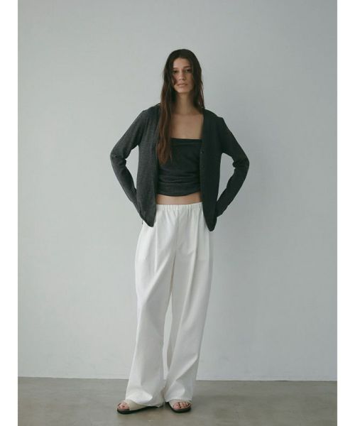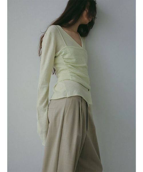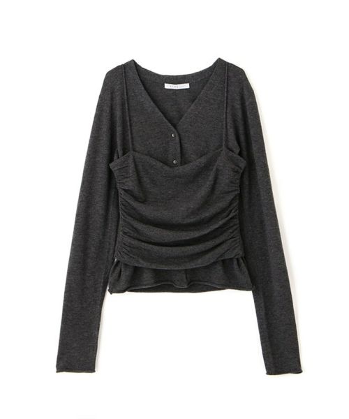 【デザイン】 ETRE TOKYO(エトレトウキョウ)のニットセット。カーディガンとベアキャミソール、それぞれの魅力を引き出すデザインで、単品でもセットでも着まわし力の高い一着です。深めのVネックカーディガンはデコルテをすっきり美しく演出し、袖口・裾のリブを排したミニマルな仕立てがきちんと感の中にも抜け感のある印象に。セットのキャミソールは、ボディラインに寄り添うドレープが華やかな表情を演出。細ストラップでヘルシーな肌見せを叶えつつ、レイヤードスタイルにも映える絶妙なシルエットです。ワイドパンツでゆるめに、シャープなボトムでクリーンにまとめたり、スタイリング次第で印象が変わる自由度の高さもポイントです。