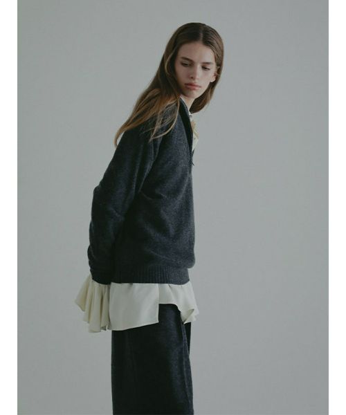 【デザイン】しなやかな風合いと軽やかな着心地を両立させた、ハイゲージ編みのニットプルオーバー。 上質なウール100%の糸を使用、特殊な仕上げによってふんわりとした柔らかさと、繊細な表面感が際立つ一枚に仕上げました。 首元はリブ編みのタートルネック仕様で、適度なフィット感がありながらも締め付けすぎず快適な着用感を叶え、肌寒い季節にも頼れる存在。 フロントにはハーフジップデザインを取り入れており、ジップの開閉具合で抜け感を加えたり、タートルを折り返してニュアンスを変えたりと、アレンジも自在です。 シルエットはほどよくコンパクトで、幅広いスタイリングに対応。 袖口と裾も同素材のリブで切り替え、さりげない引き締め役に。 ベーシックでありながらディテールにこだわりが感じられ、シーンを問わず活躍する万能アイテムです。 一枚ではもちろん、アウターのインナーとして、またトレンドライクなレイヤードスタイルも叶える、秋冬のワードローブに頼れる存在のニットです。