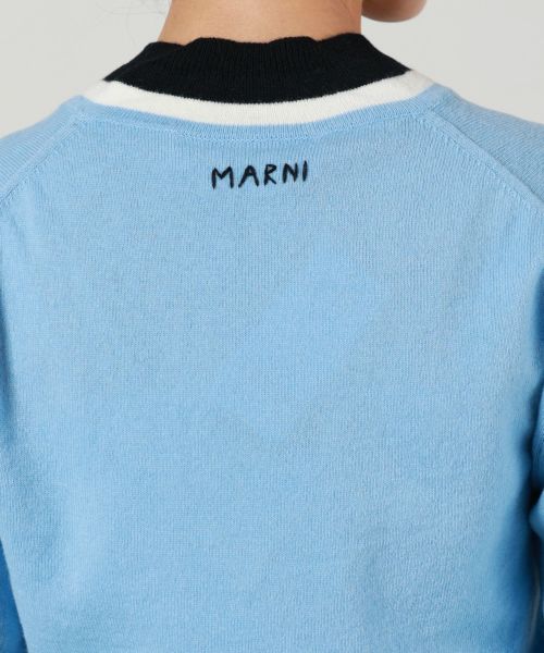 【デザイン】MARNI(マルニ)のニット。深めのVネックラインが顔周りをすっきりと見せ、洗練された印象を与えます。ネック部分の切替え配色が程よいアクセントとなり、シンプルな中にも遊び心を感じさせるデザイン。バックの首元にはMARNIロゴの刺繍が施され、後ろ姿にもさりげない個性をプラスしています。程よいゆとりのあるシルエットで、シャツやカットソーとのレイヤードにも最適。オン・オフ問わず着回しやすい一着です。