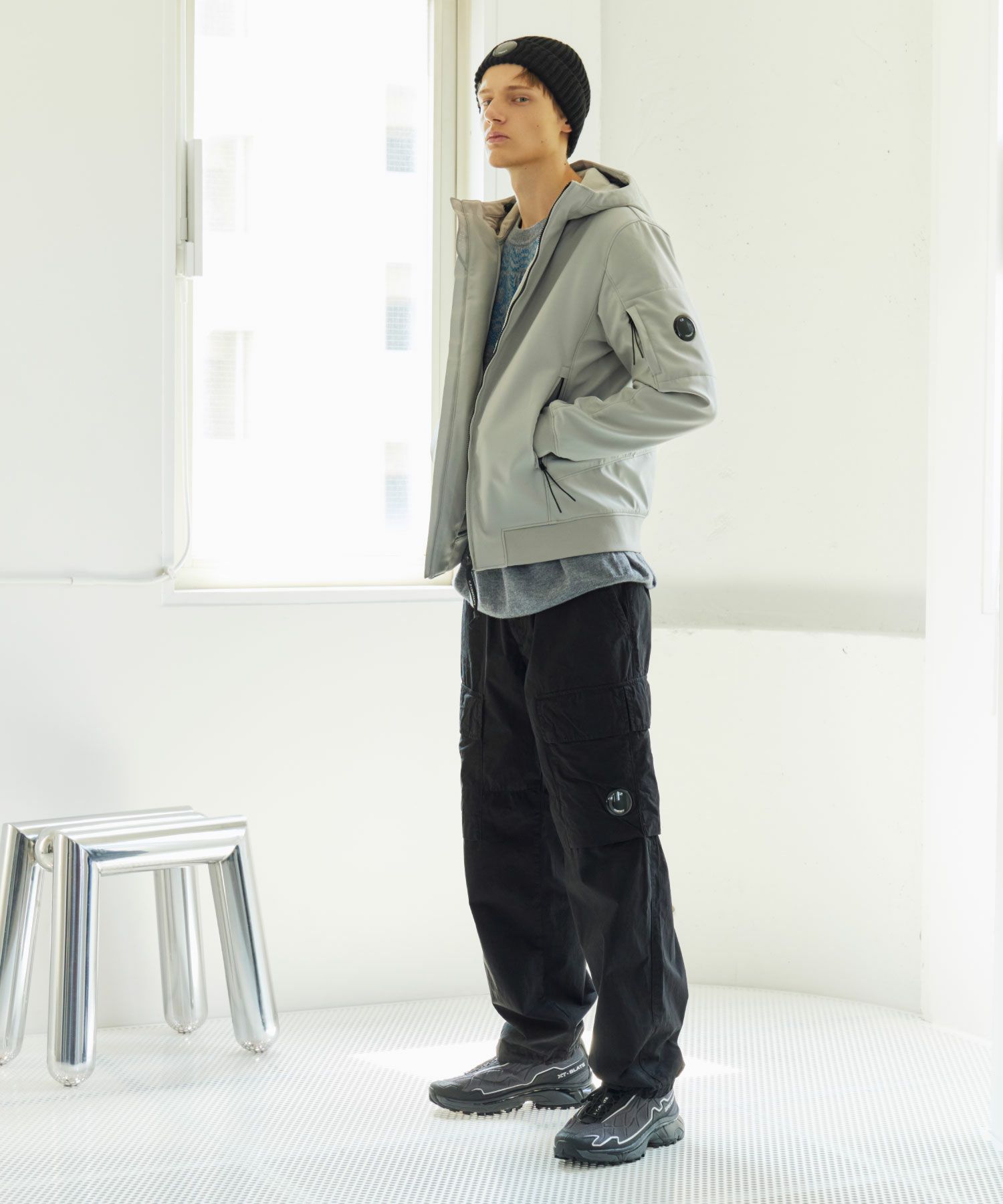 【デザイン】 C.P. Company(シーピーカンパニー)のソフトシェルフードブルゾン。ハイネック仕様のフーデットで、比翼ファスナーが全体的にミニマルな印象を強調。袖と裾のリブでスポーティなデザインに仕上がっています。左袖には C.P.カンパニーのアイコンであるレンズが配置されています。