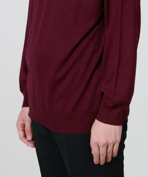 【デザイン】無駄を削ぎ落としたシンプルさが魅力。シルクとカシミヤを使用しており高級感と着心地の良さを兼ね備えたニットは、ジャケットの襟に干渉しにくく、上品でありながらカジュアルに使える万能なアイテムです。