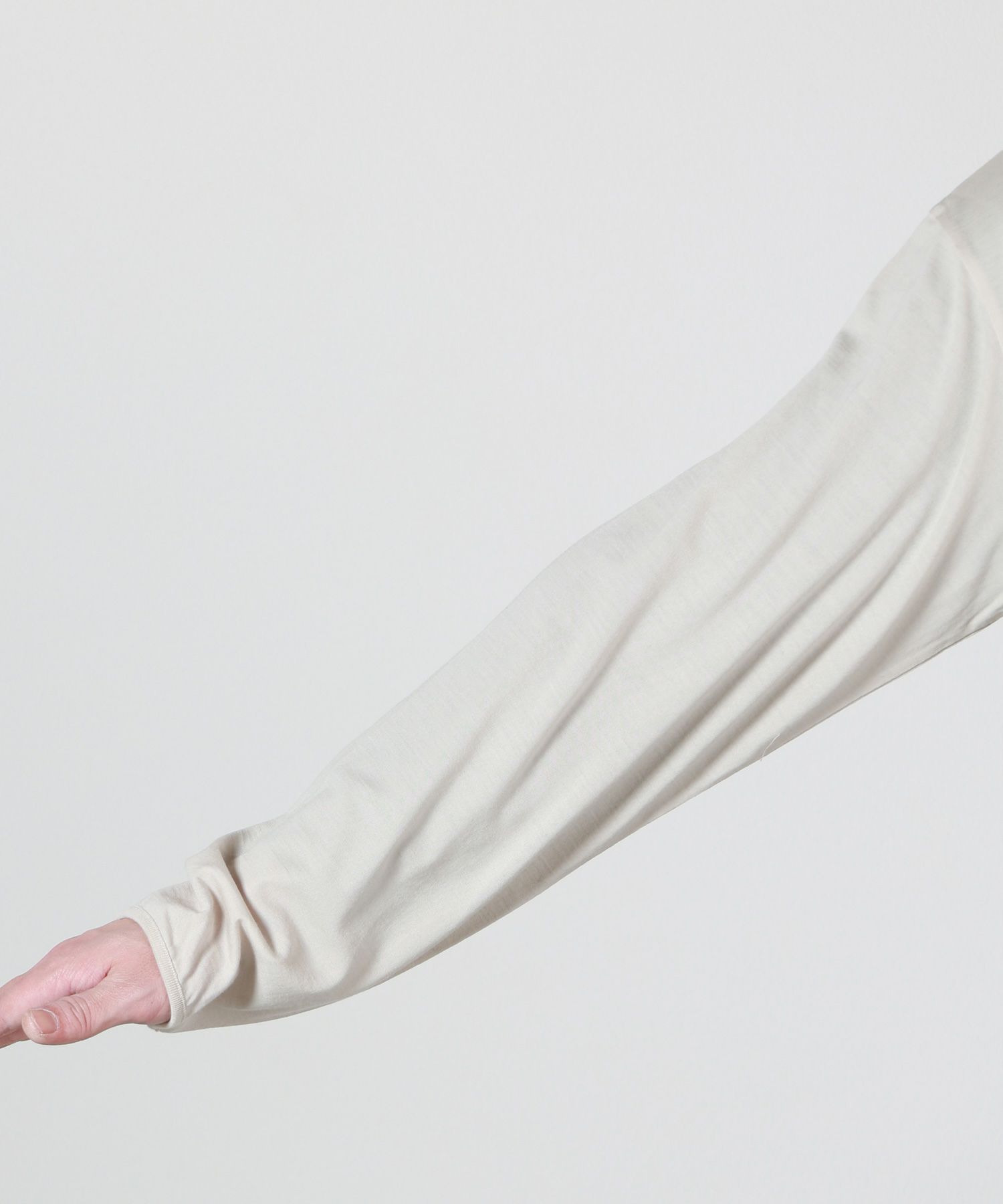 【素材】 南米ウルグアイでデザイナー自らが厳選したスーパー160'sウールを使用。原料のワタ段階で防縮加工を施し、90番手に紡績した糸を用いて、ハイゲージのウール天竺へと仕上げています。上質な原料を使うことで肌への刺激が少ないスムースな着心地に加えて、家庭での洗濯が可能な実用性も兼ね備えた最高級のオリジナルウールTシャツ素材です。