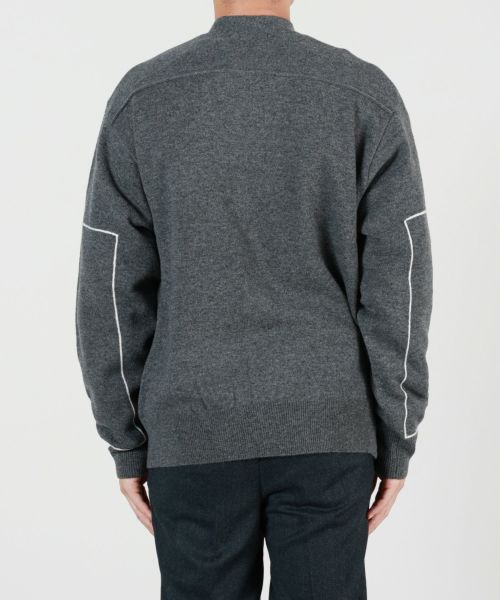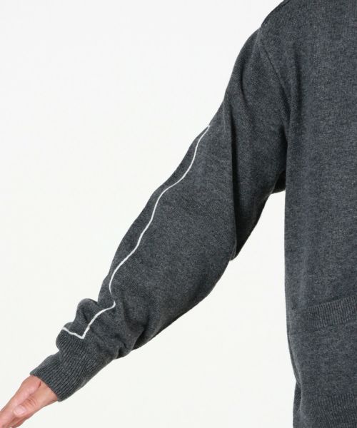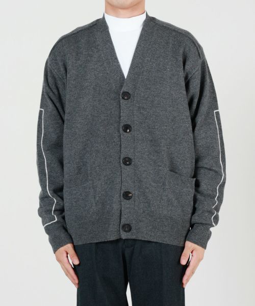 【デザイン】 CINOH(チノ)のニットカーディガン。スタンダードなデザインの肘と袖にアクセントとなるホワイトラインが配されています。ゆったりとしたボクシーなシルエットの一枚です。