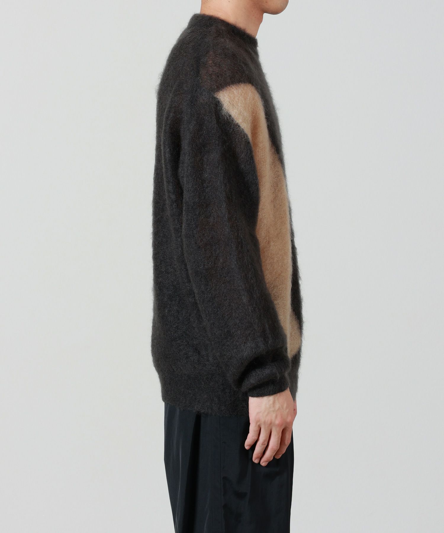 【デザイン】YOKE(ヨーク)のニット。マン・レイのフォトグラムの技法をイメージして、作成したインターシャセーターです。 影絵のようなイメージを袖を折り返した部分だけ色が変わっているデザイン。ワイドフィットシルエットです。