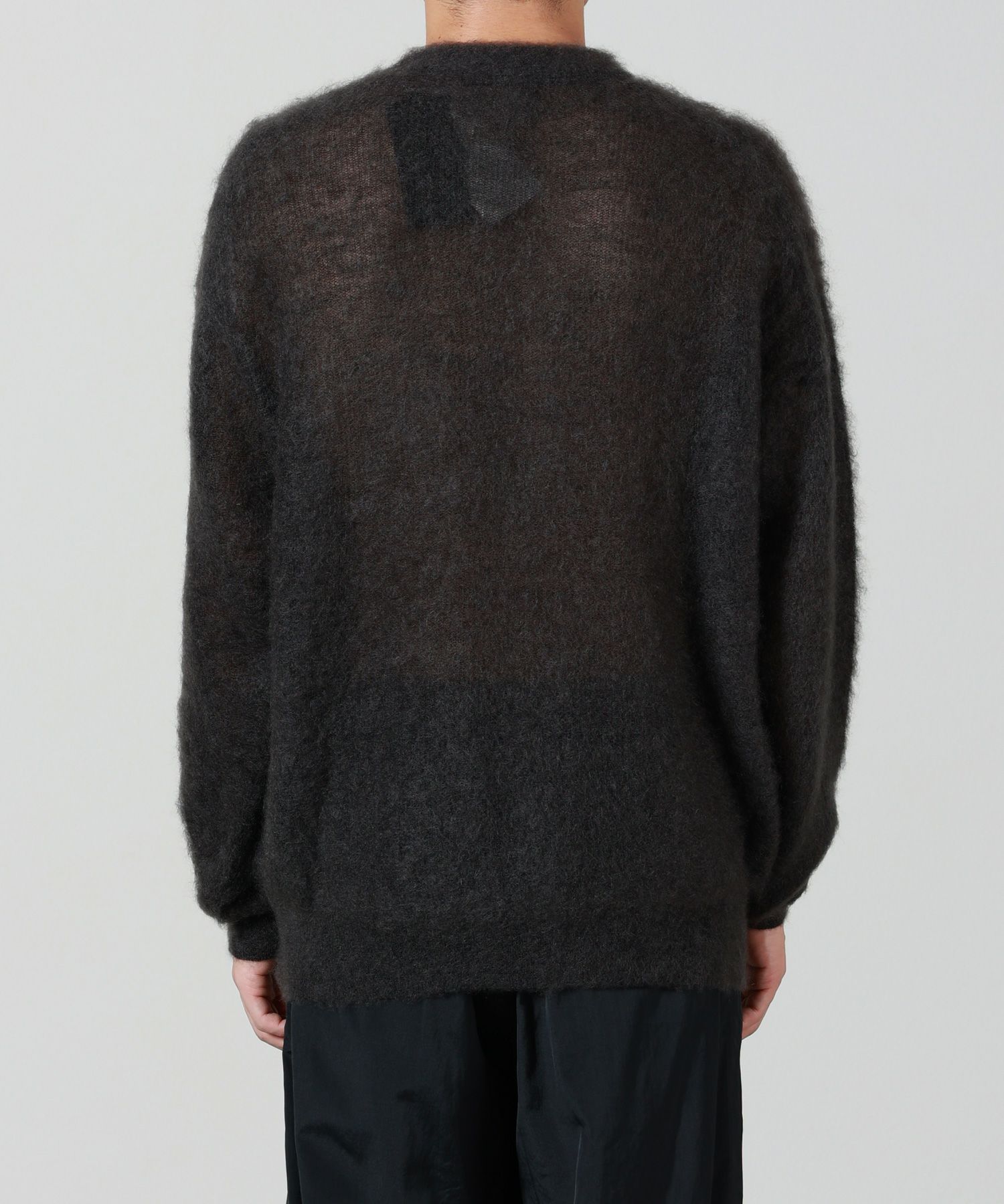 【素材】繊維が細くしなやかで光沢のあるキッドモヘアでざっくりと甘編みで透け感が出ています。