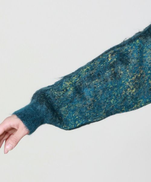【素材】モヘアならではの軽やかなふわっとした質感と、ウールやアクリルの柔らかな感触が融合した、肌触りの良い素材感です。モヘアの特性である保温性と軽さにより、寒い季節にも暖かく、軽やかな着心地を提供します。見た目にも上品な毛足が、着る人の動きに合わせてふわりと揺れ、視覚的な楽しさもプラス。