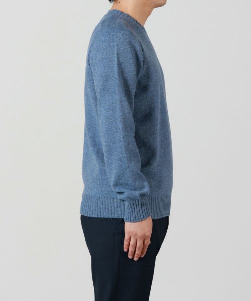 【デザイン】Gran Sasso(グランサッソ)のニット。ベーシックなクルーネックのミドルゲージニットで、シンプルさの中に上質さが光る一枚です。肩まわりはラグランスリーブ風の切り替えで動きやすさを確保し、全体はコンパクトで日本人の体型に合わせやすいバランスに設計されています。脇下から身頃にかけては程よいゆとりを持たせ、着心地とシルエットの美しさを両立。デザインを極力抑えているからこそ、カジュアルにも、アウターのインナーにも取り入れやすい万能なアイテムです。カットソーの上にさらりと重ねるだけでもサマになり、ライダースやコートを羽織ったスタイルにもよく映えます。