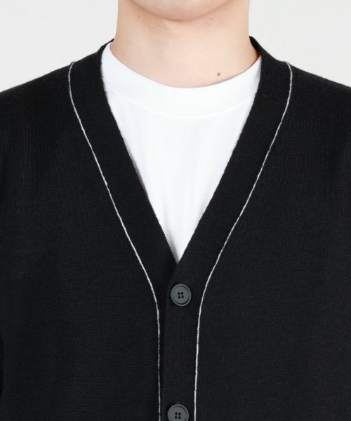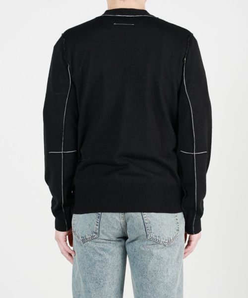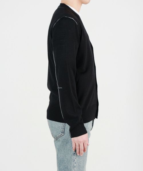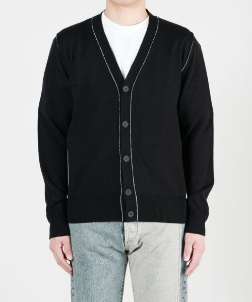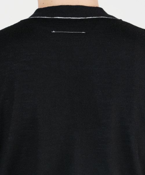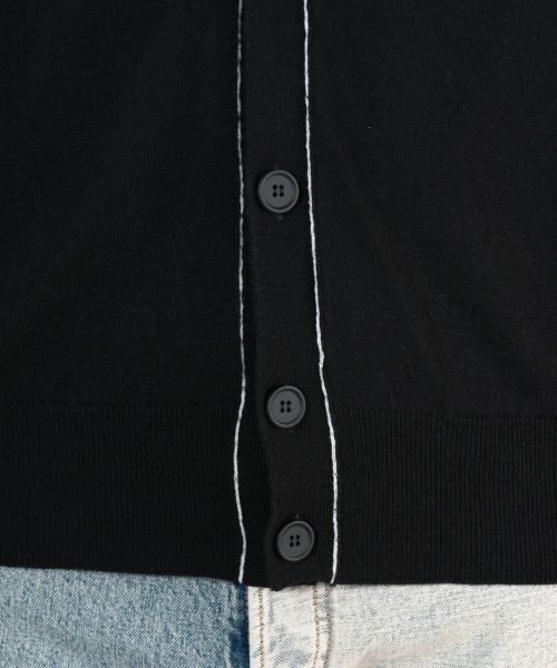 【デザイン】 MM6 Maison Margiela(エムエムシックス メゾン マルジェラ)のVネックニットカーディガン。リブ編のトリミングとコントラストカラーのステッチがアクセントとなっています。ボタン開閉で、フロントに刺繍したブランドのNumericシグネチャーがポイント。バックには、控えめながらはっきりとしたMM6のシグネチャー、1本の白いステッチのラインも施されています。
