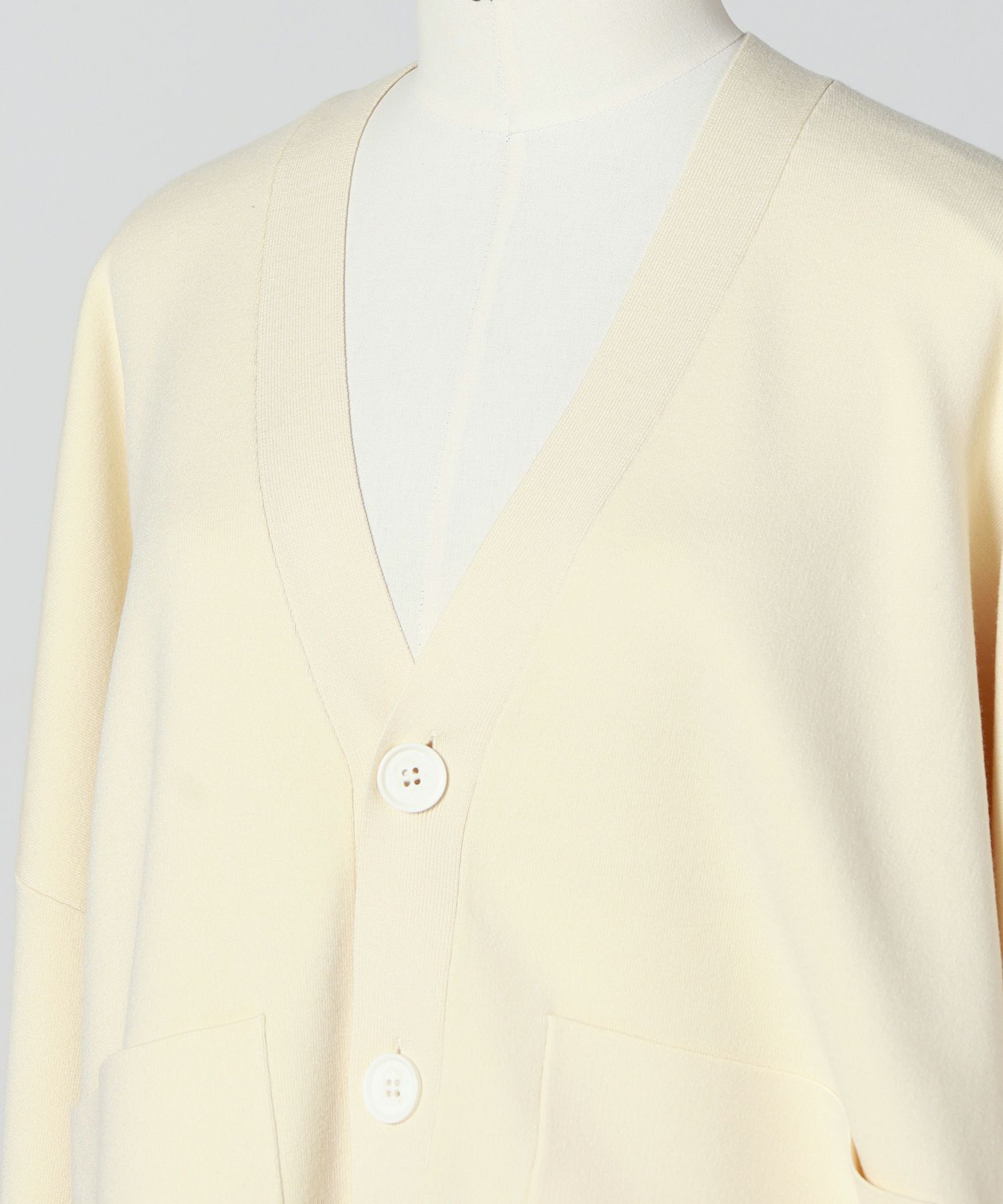 【素材】レーヨン×ポリエステルを基調としたニット混紡素材 を使用。肌触りは滑らかで、しなやかなストレッチ性がありつつ柔らかい風合いが特徴です。型崩れしにくく、適度なハリ感と程よいボリューム感が保たれるため、季節を問わず オールシーズン活躍。春先のアウターとして着用するのもオススメです。