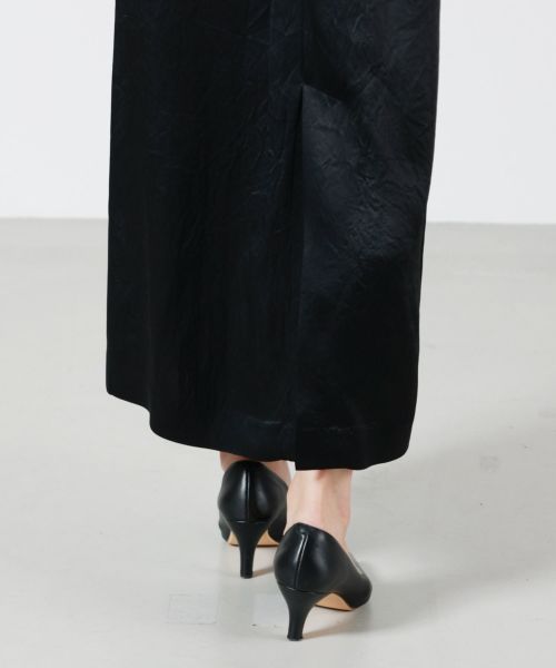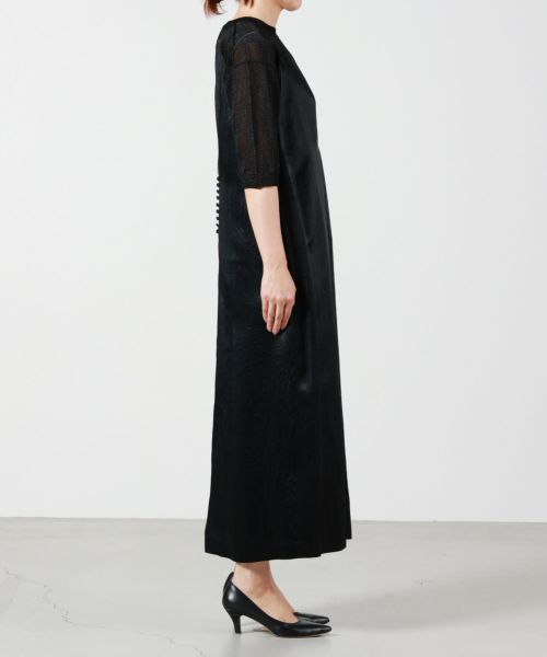 【素材】表地には、しっとりとした艶感が美しいアセテート100%の光沢感のある素材を使用。光の当たり方でさりげなく輝く上品な光沢が、ドレッシーで落ち着いた印象を与えます。滑らかで柔らかく、肌に吸い付くような感触で着心地も快適。裏地にはキュプラを採用し、静電気を抑えながらスムーズな着脱をサポートします。1枚で着映えし、ロングシーズン活躍する素材感です。