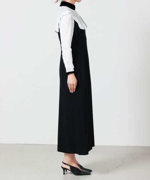 【デザイン】Mame Kurogouchi(マメ クロゴウチ)のワンピース。トリアセテートとポリエステルのジョーゼットを使用したベルベットカラードレス。ウエストをシェイプさせた落ち感のあるシルエットが縦のラインを強調し、スタイルアップを叶えます。袖の刺繍は薄手のシフォンに施され、襟の刺繍はオーガンジー生地にあしらうことで立体感と華やかさを演出。オリジナルの花柄オーガンジーレースが首から肩にかけて華奢な印象を与え、上品でエレガントな着こなしを実現します。