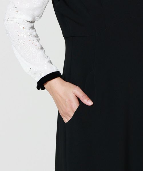 【素材】表地はトリアセテート70%、ポリエステル30%のジョーゼットで、膨らみのある糸とポリエステル混合により、柔らかくストレッチ性のある生地感が特徴。シワになりにくくイージーケアで扱いやすいのも魅力です。袖や襟の刺繍部分はそれぞれシフォン・オーガンジー素材を使用し、軽やかで上品な透け感と光沢を楽しめます。裏地はポリエステル100%で滑らかに体に沿います。