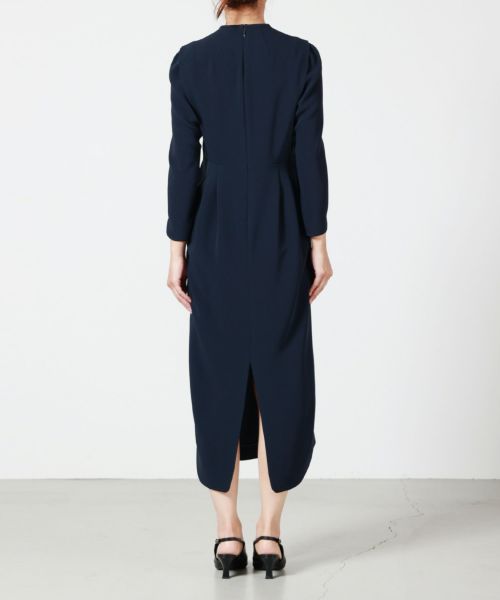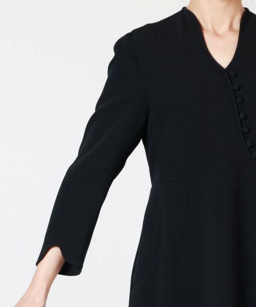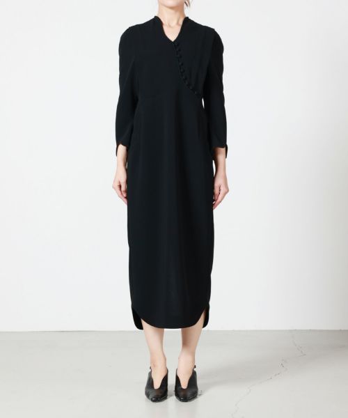 【デザイン】Mame Kurogouchi(マメ クロゴウチ)のワンピース。カーブするネックラインからくるみボタンが連なるブランドシグネチャーデザインで、着物の抜けた襟から着想を得たネックラインがセンシュアルな印象を演出。身体のカーブに沿う緩やかなシルエットと落ち着いたカラーパレットで、様々なシーンで洗練されたスタイルを叶える1着です。