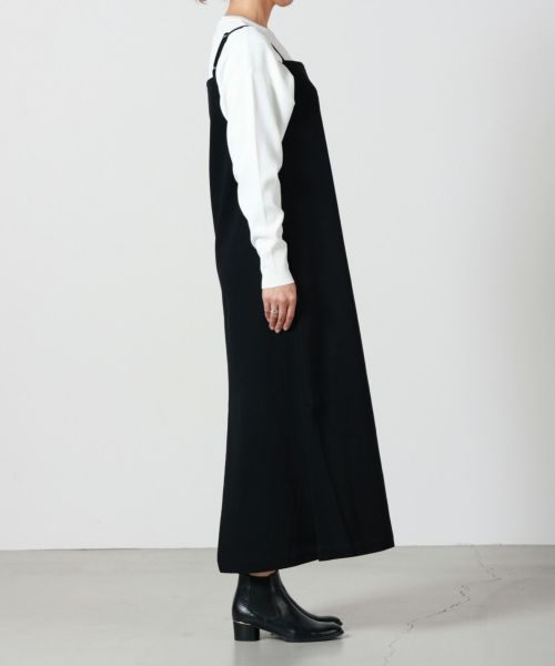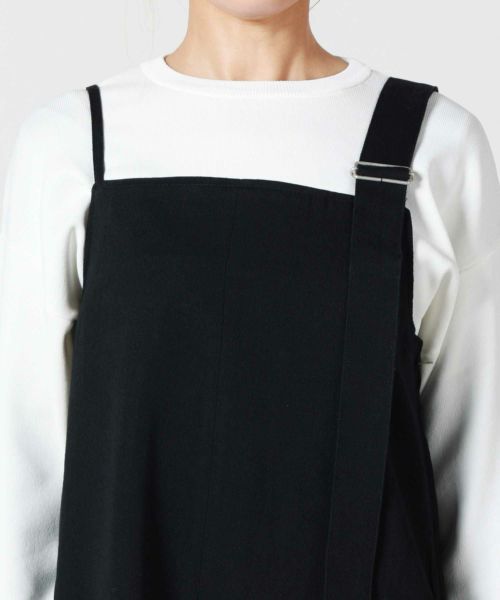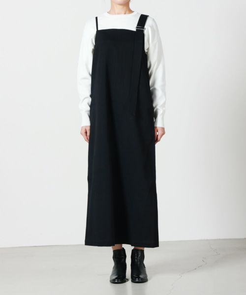 【デザイン】ストラップがアシンメトリーなデザインで、アクセントになったワンピース。寒い季節もレイヤードスタイルで活躍するワンピースです。 ほどよくAラインのシルエットで体型カバーをしてくれます。 生地は、世界的一流メゾンブランドにも採用されているクロキの生地を使用。BKの生地は10。5オンスのコンパクトヤーンを使用した生地です。コンパクトヤーンは毛羽を最小限に抑えた紡績技術で作らた糸のため、ソフトで滑らかなタッチと光沢感のある面とハリ感が特徴です。
