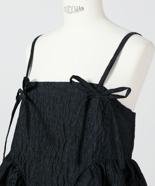 【デザイン】Cecilie Bahnsen(セシリー バンセン)のワンピース。ブランドの代名詞ともいえるベビードールシルエットを採用し、直線的なネックラインと立体的なヒップパネル、肩にあしらわれたリボンディテールがフェミニンなアクセントを添えています。シンプルな構造ながらも、巧みなパターンワークによってシルエットに奥行きが生まれ、日常から特別なシーンまで幅広く着こなせる“エブリデイ・クチュール”な一着です。背面はコンシールファスナーで仕上げ、後ろ姿までクリーンでシームレスな印象を演出します。