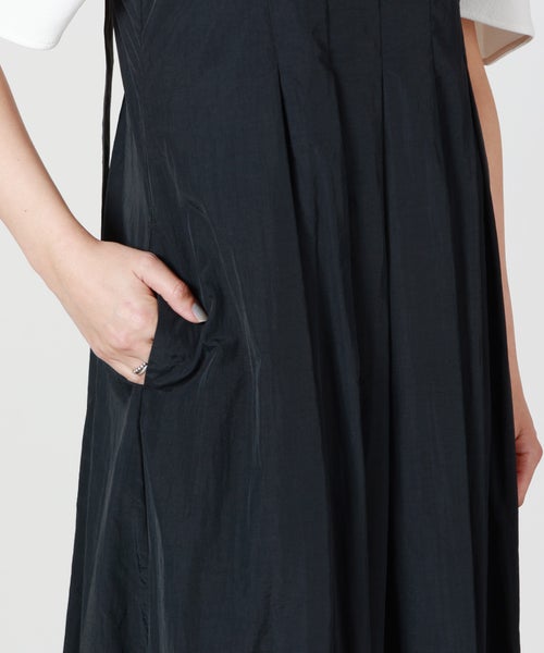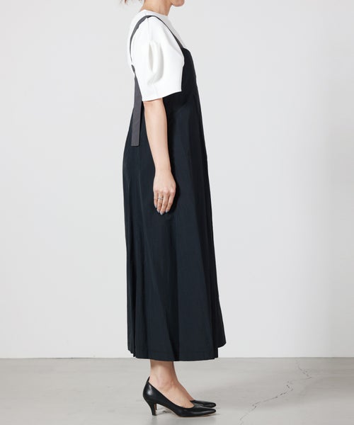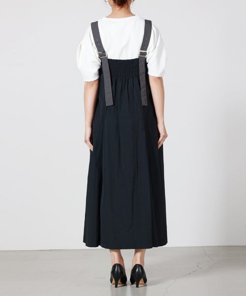 【デザイン】ELENDEEK(エレンディーク)のワンピース。バイカラーデザインのショルダーストラップがアクセントになったタックワンピース。上品なフレアシルエットながら、ハリのある素材感によって甘さを抑え、モードな印象に仕上げています。バスト部分はタックを縫い留めることでボリュームを抑え、すっきりとしたバランスに。後ろはシャーリング仕様でフィット感があり、ストレスフリーな着心地を実現しています。肩紐はバックルで調整可能なため、フィット感の微調整やレイヤードスタイルにも対応。