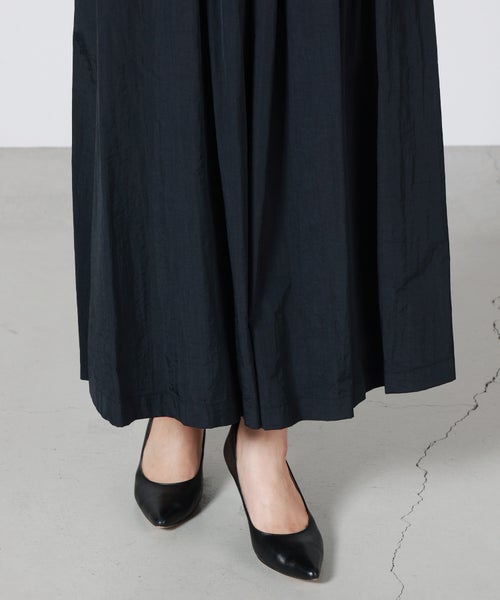 【素材】軽量でハリのある素材を使用。触れるとさらりとしたドライタッチで、肌離れが良く快適な着心地が特徴です。しっかりとした質感がありながらも軽やかで、フレアシルエットを美しくキープ。見た目にも程よい光沢感とシャープさがあり、カジュアルになりすぎず洗練された印象を与えます。シワになりにくく扱いやすい点も魅力です。