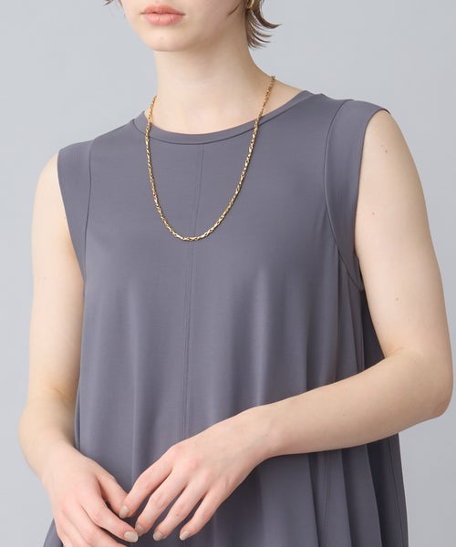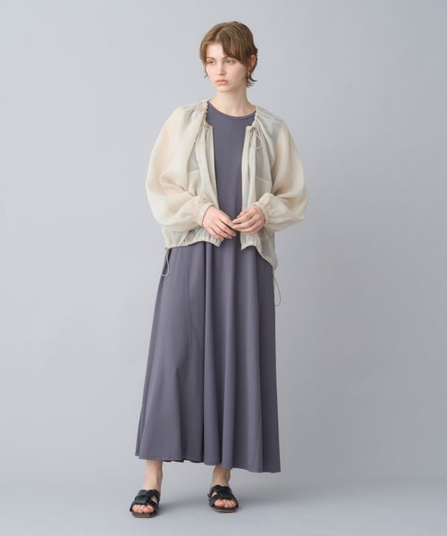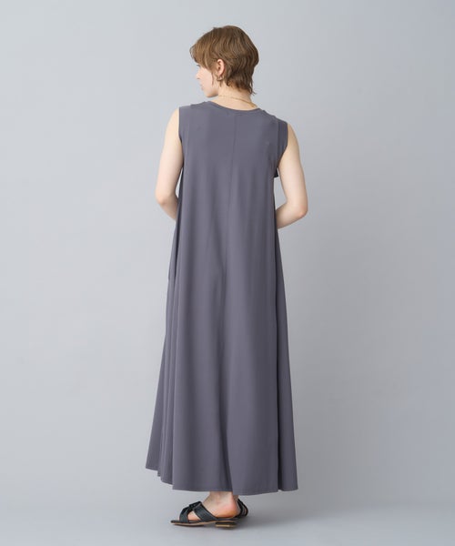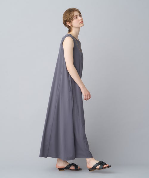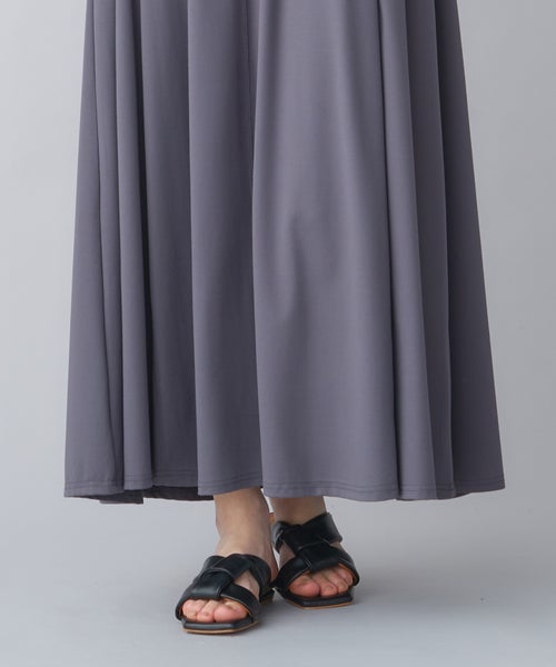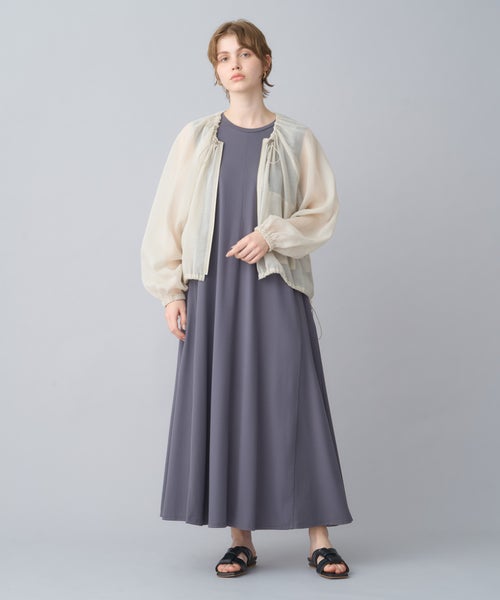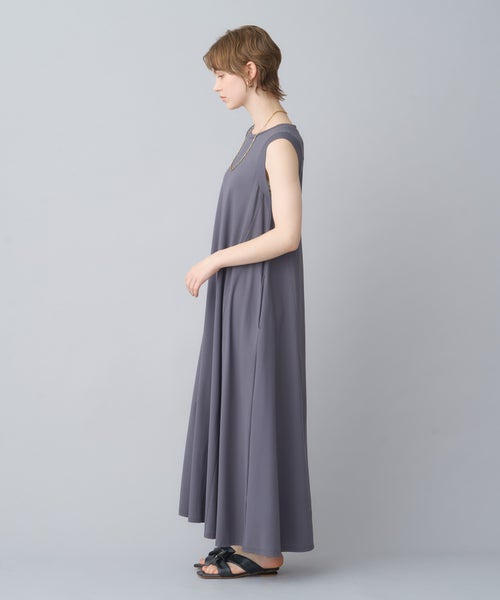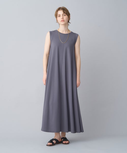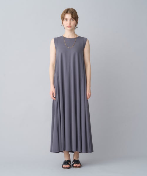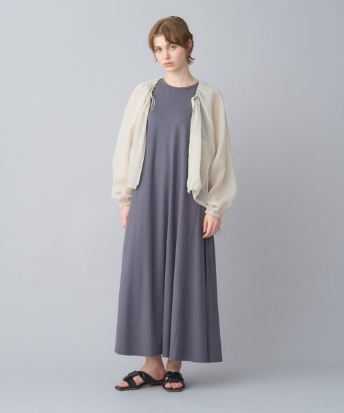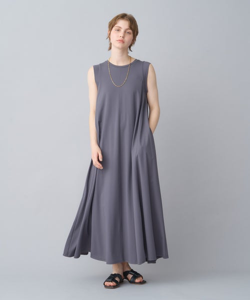 【デザイン】PARIGOT(パリゴ)のワンピース。夏にぴったりなカットソーワンピースは、シンプルなデザインながらも、シルエットと素材にこだわり、大人の女性にふさわしい上品さを演出します。トップス部分はすっきりとしたサイズ感で、ウエストから裾にかけてたっぷりとドレープを施し、動きのあるニュアンスをプラスしました。フェミニンなフレアラインは、体型カバー効果もあり、スタイルアップにも一役買います。