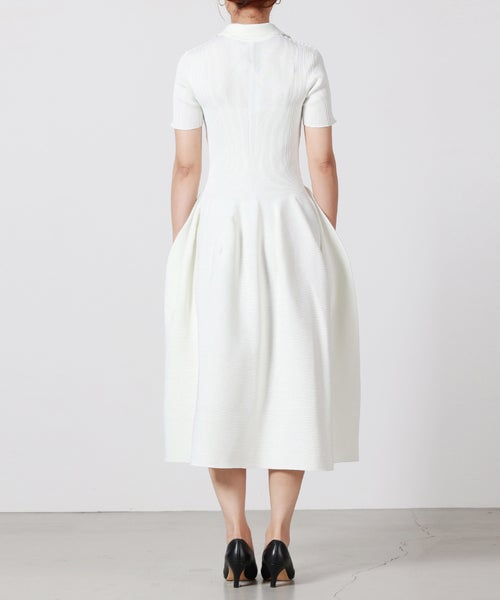 【デザイン】CFCL(シーエフシーエル)のワンピース。CFCLを象徴するPOTTERYシリーズのドレスです。コンピュータープログラミングによって作られたボリューム感のある立体的なフォルムに加え、襟元がスプリッドカラーで、リブ組織で描いた柄が特徴です。編み込まれたラメ糸がさりげなく華やかさを演出してくれます。どんなシーンでも一際目を惹く存在感を放つ主役級アイテムです。