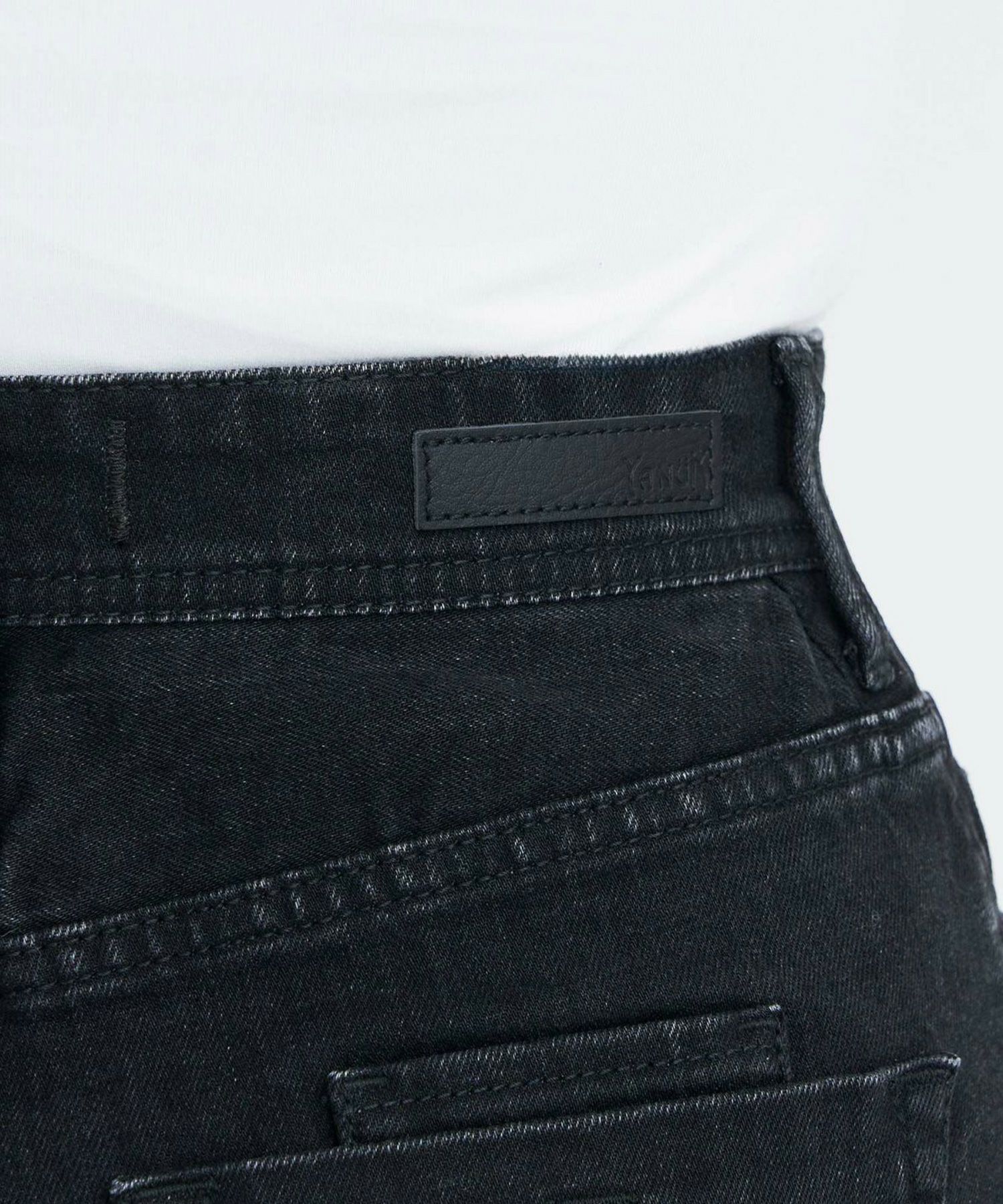 フラットな印象になりやすいカラーパンツとは違い、ブラックデニムに加工感を施すことで、デニムならではのアタリ感が生まれ、のぺっとした印象にならないブラックジーンズです。通常、ブラックデニムは黒のタテ糸×白のヨコ糸で織られているモノが多いので、加工するとコントラストが付きすぎてしまい、カジュアルな印象に仕上がりがちですが、この品番は黒のタテ糸×黒のヨコ糸で織られたブラックデニムを使用しているので、いい意味で加工感が付きすぎない、上品な印象のブラックデニムに仕上がっています。カジュアル~キレイめまで、様々なコーディネートに合わせやすい1本です。
