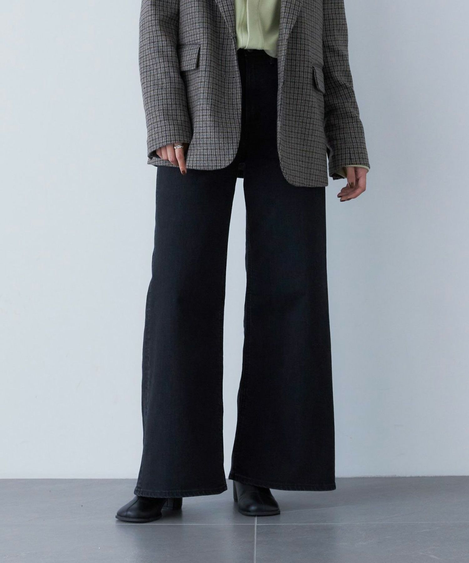 【素材】ホールド感のあるストレッチ性と、肉感を拾いすぎないハリ感が特徴のブラックデニム。スタイルを美しくキープしてくれながらも、締め付けすぎず動きやすい穿き心地抜群の生地です。