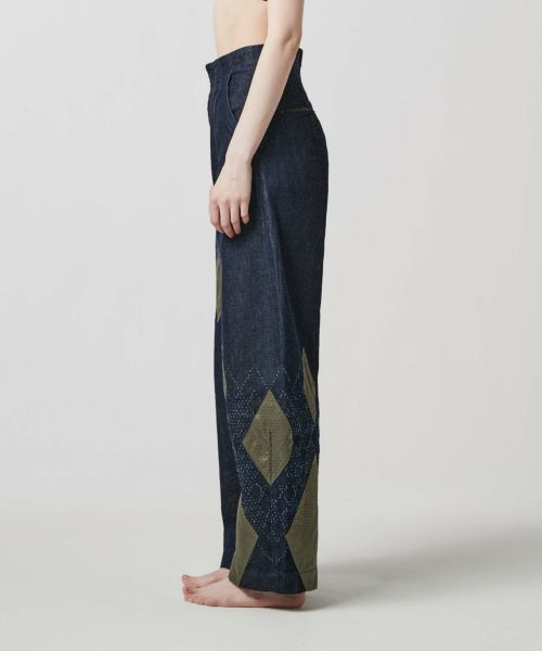 【デザイン】デニムとナイロンをコンビネーションで合わせたカーブシルエットのパンツ。 レーザーによるパンチング加工でアーガイル柄を表現しており、縫製後に洗いをかけることによって、パンチング部分に花が咲き、より立体的な表情が生まれています。 ナイロンをドッキングすることで、華やかな光沢感がある新しいデニムパンツです。